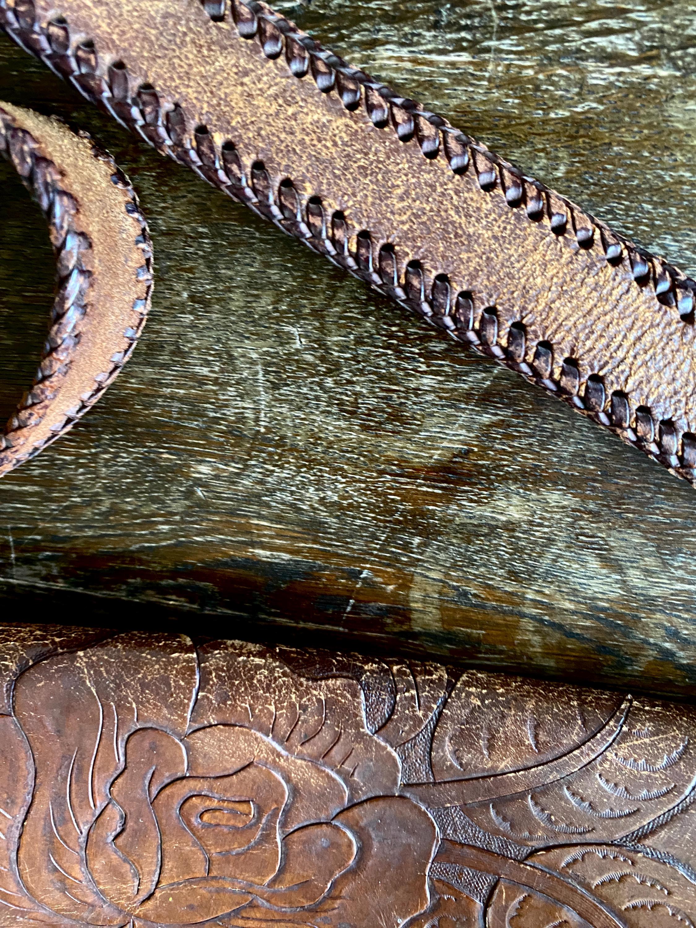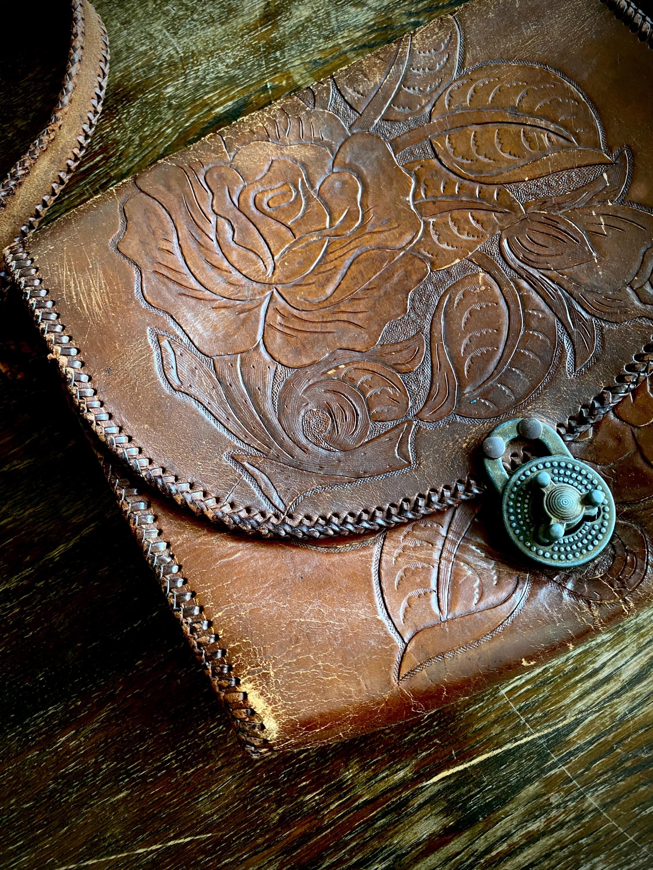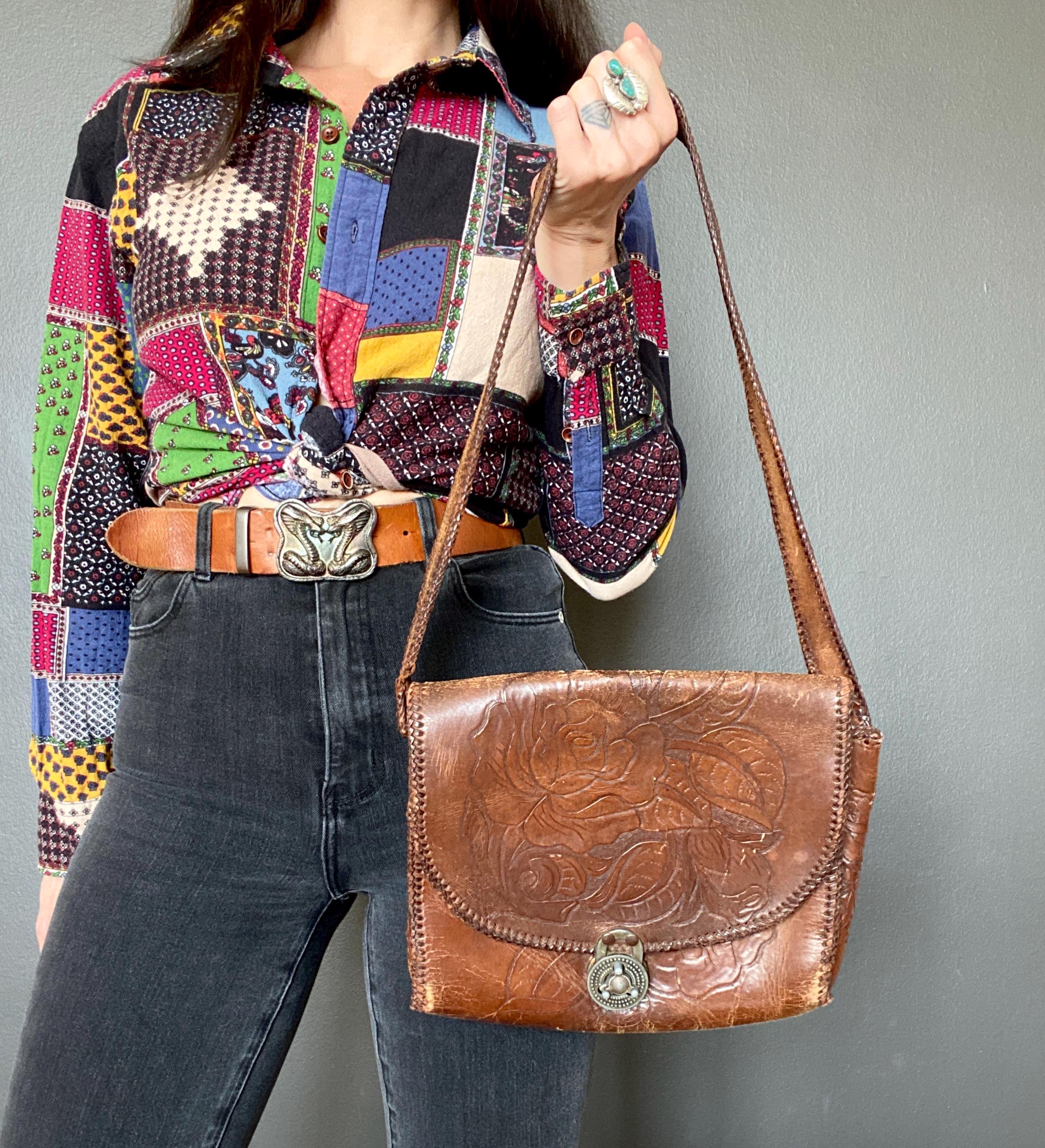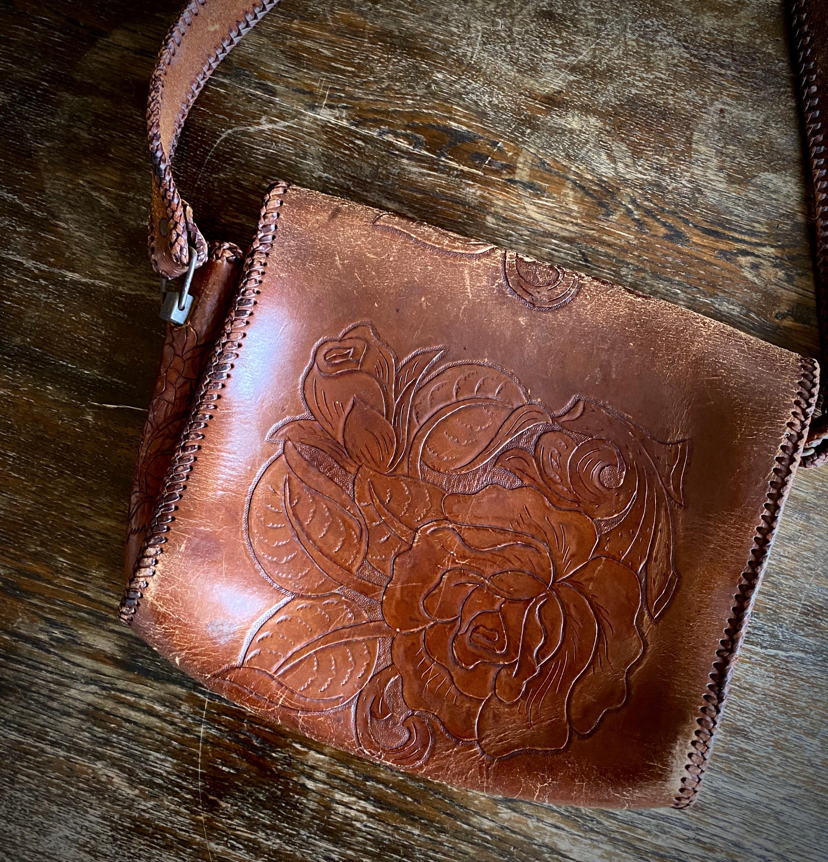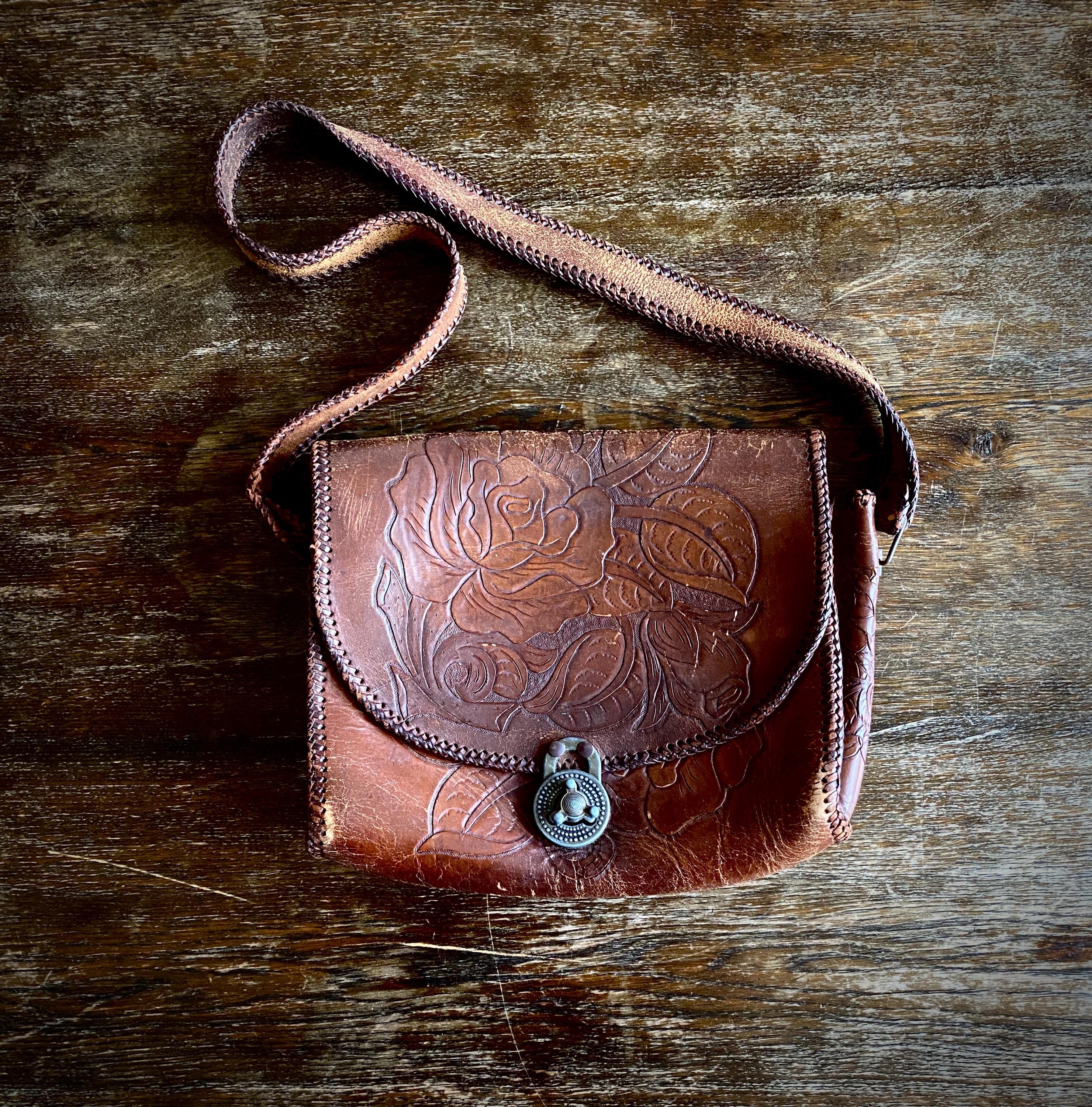 1970s tooled handmade leather shoulder bag.