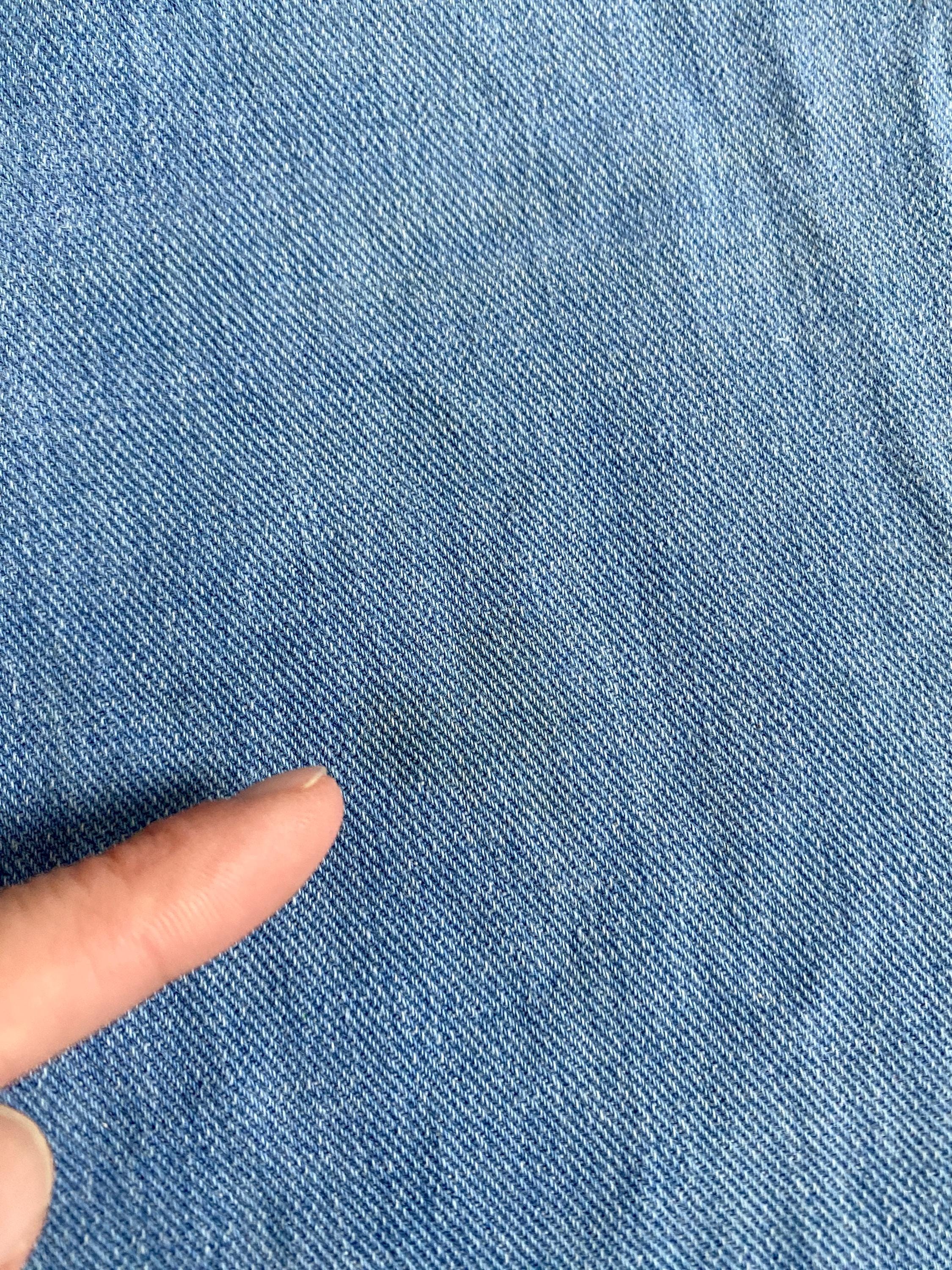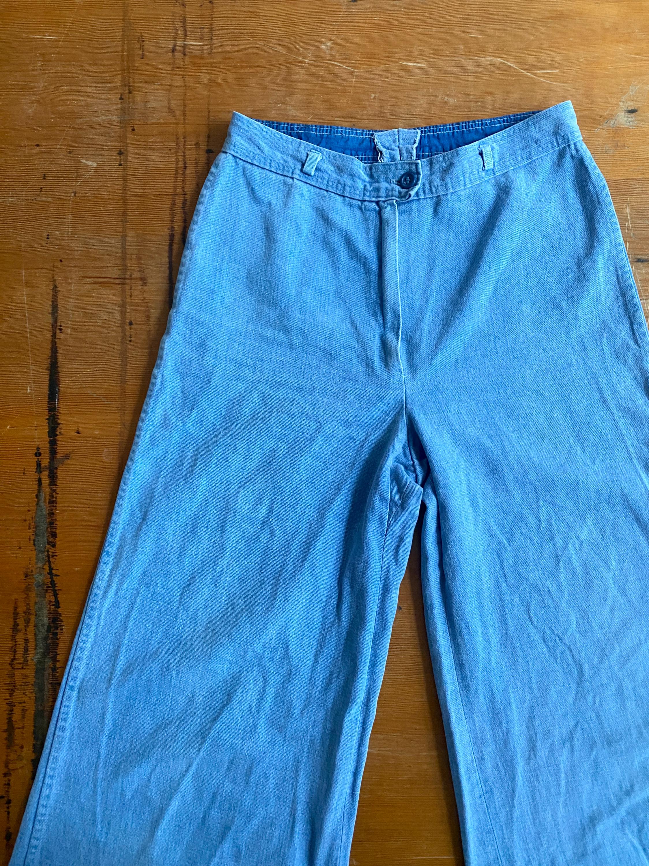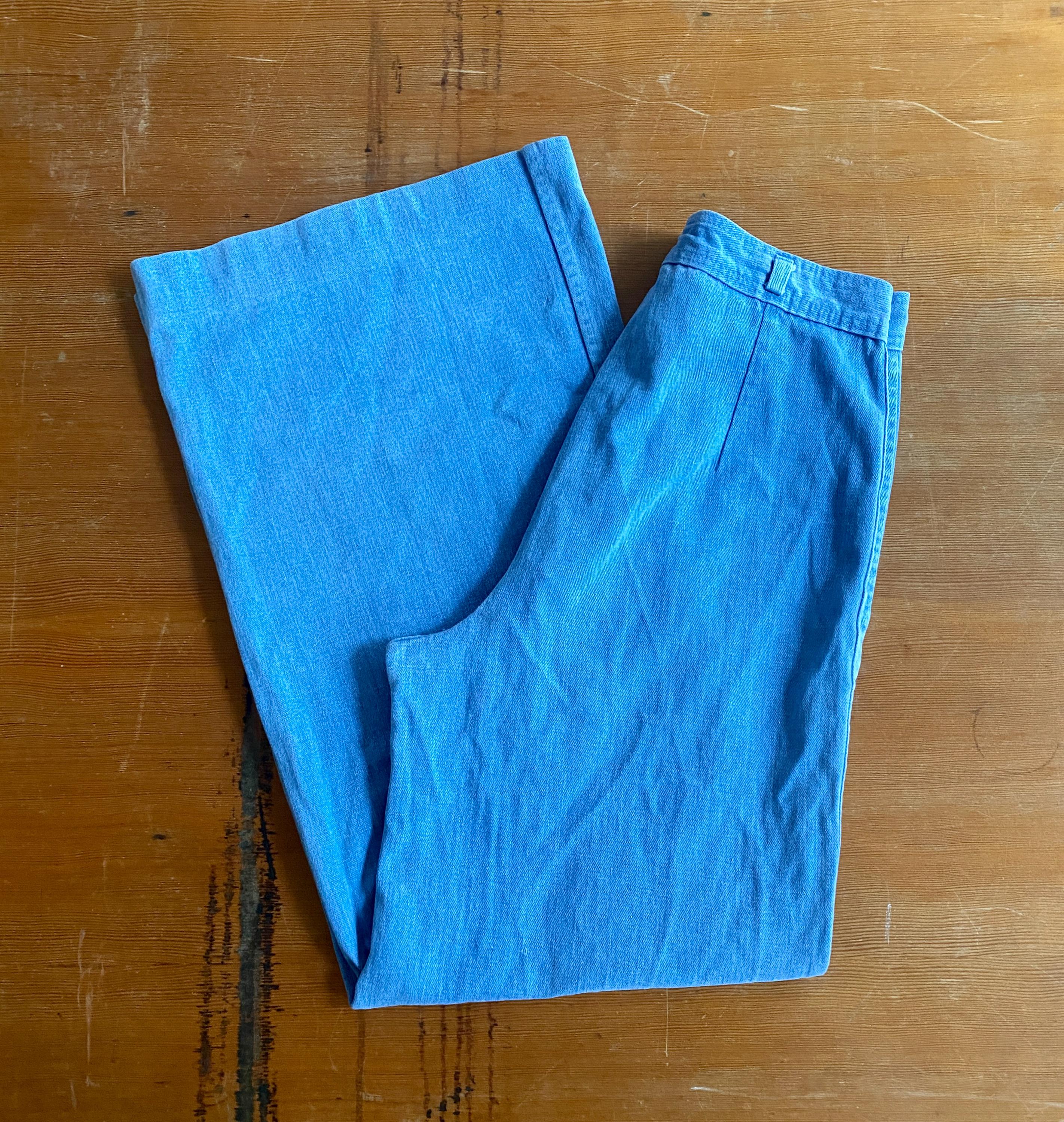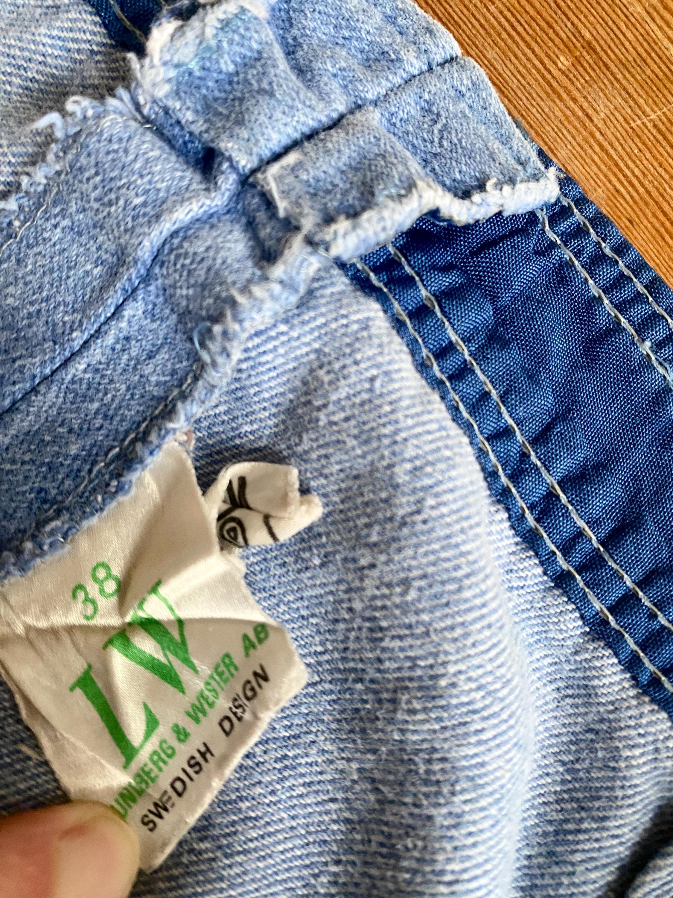 *Used vintage condition. Shows normal signs of age and wear. The denim fabric has a lovely worn in look. There's a stain on the thigh (see picture)