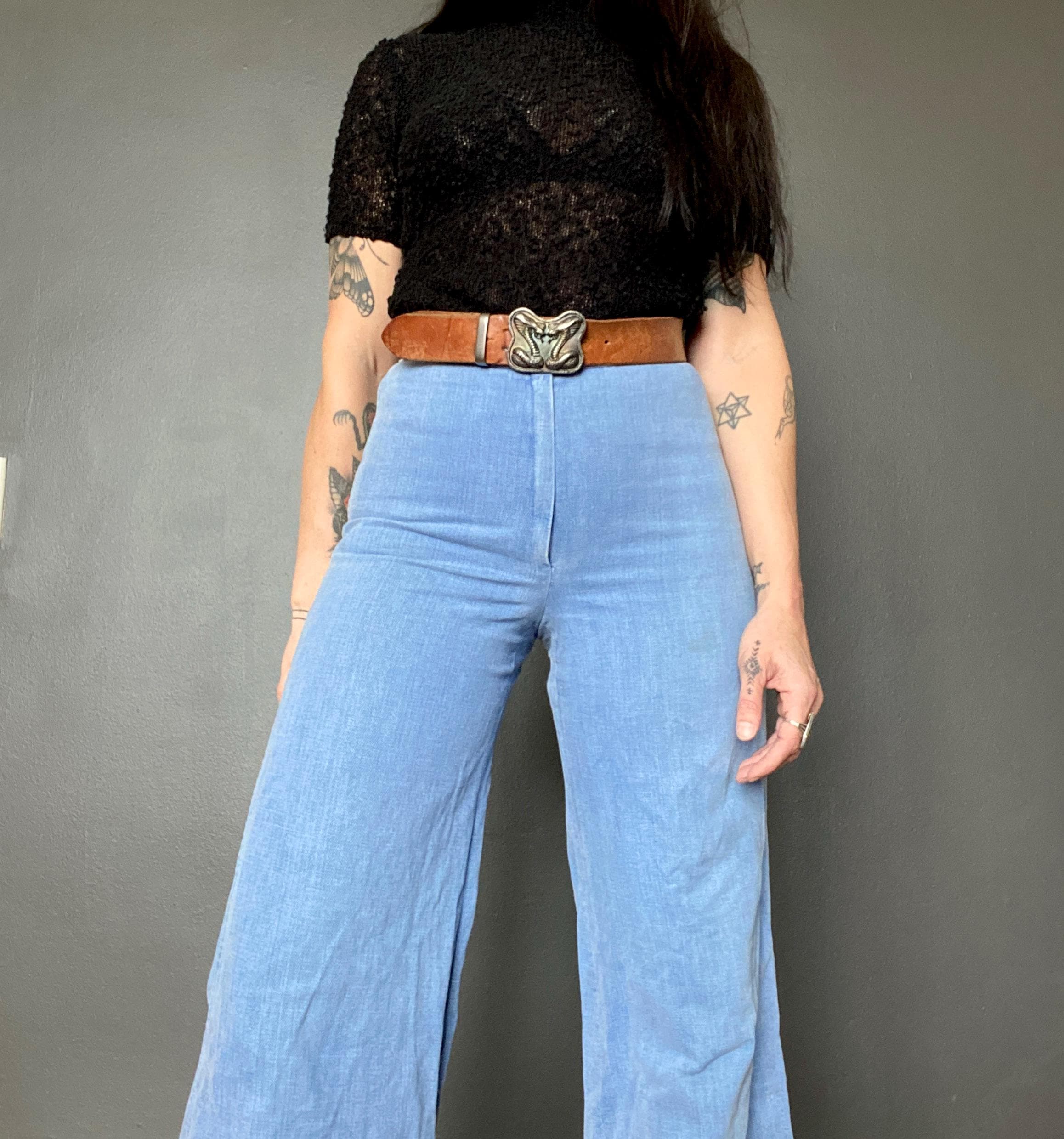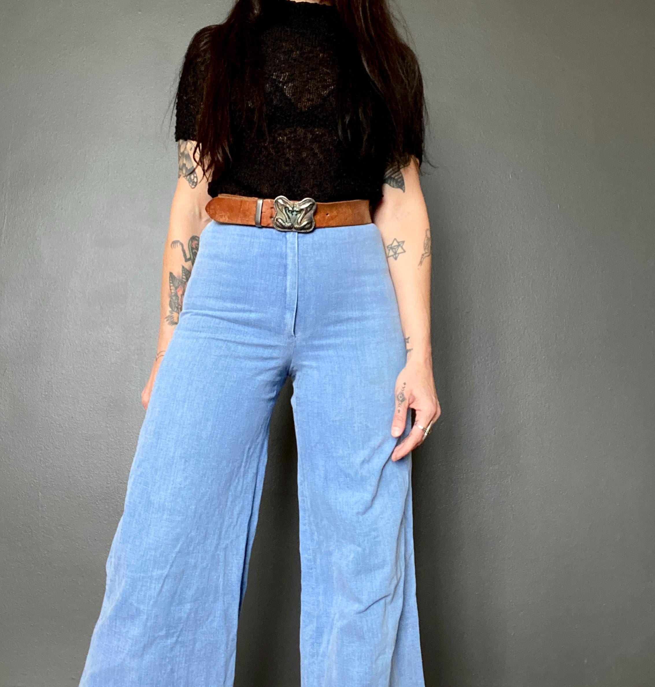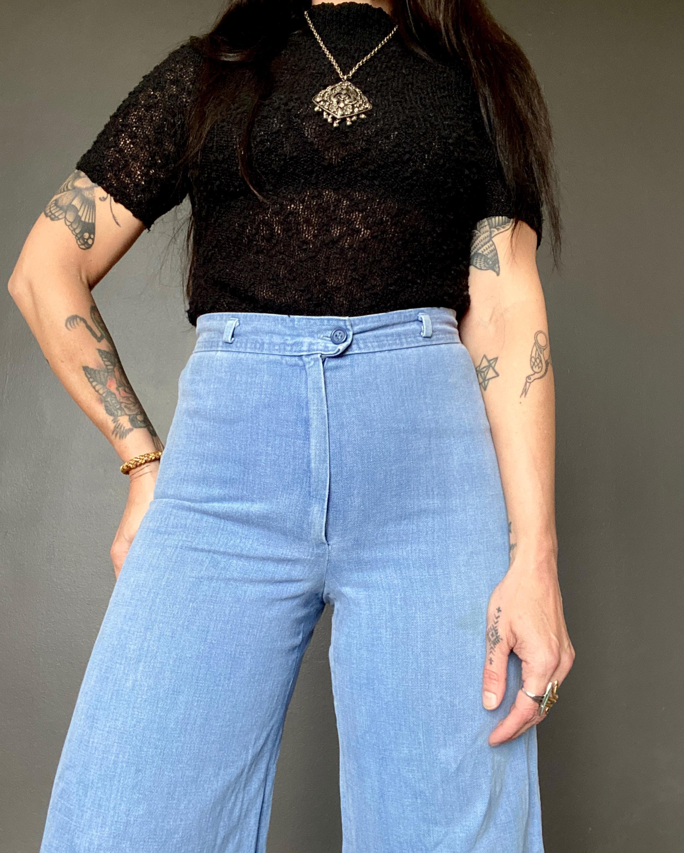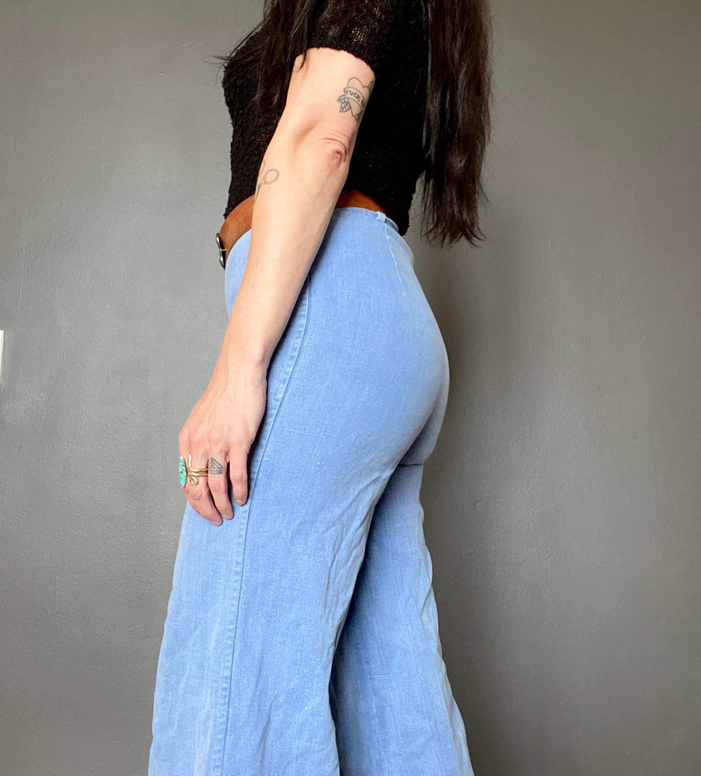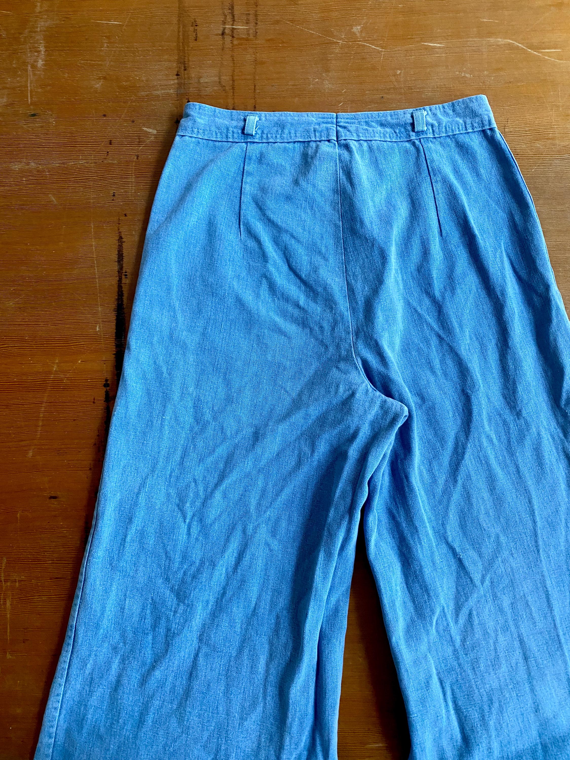 *Used vintage condition. Shows normal signs of age and wear. The denim fabric has a lovely worn in look. There's a stain on the thigh (see picture)