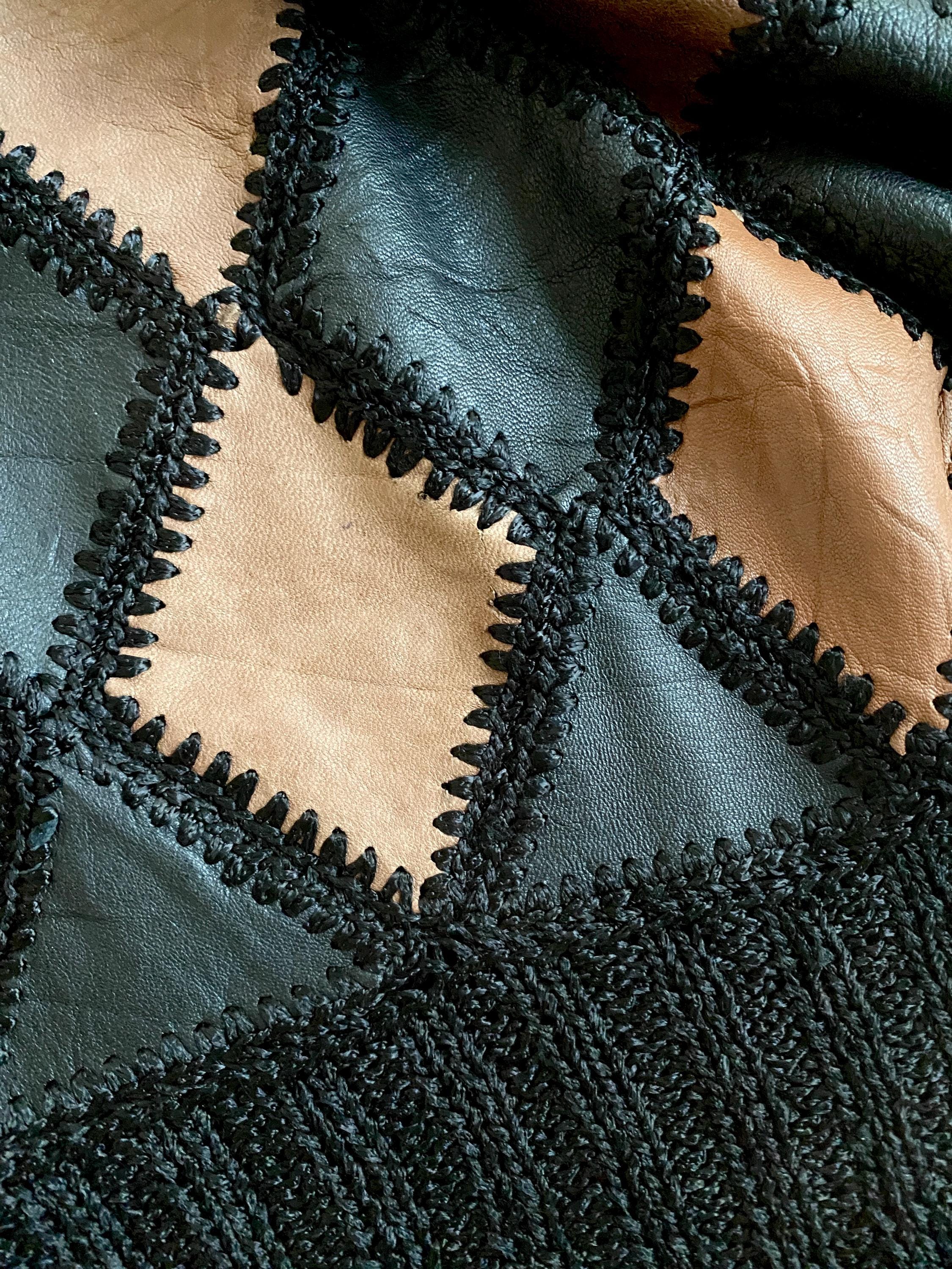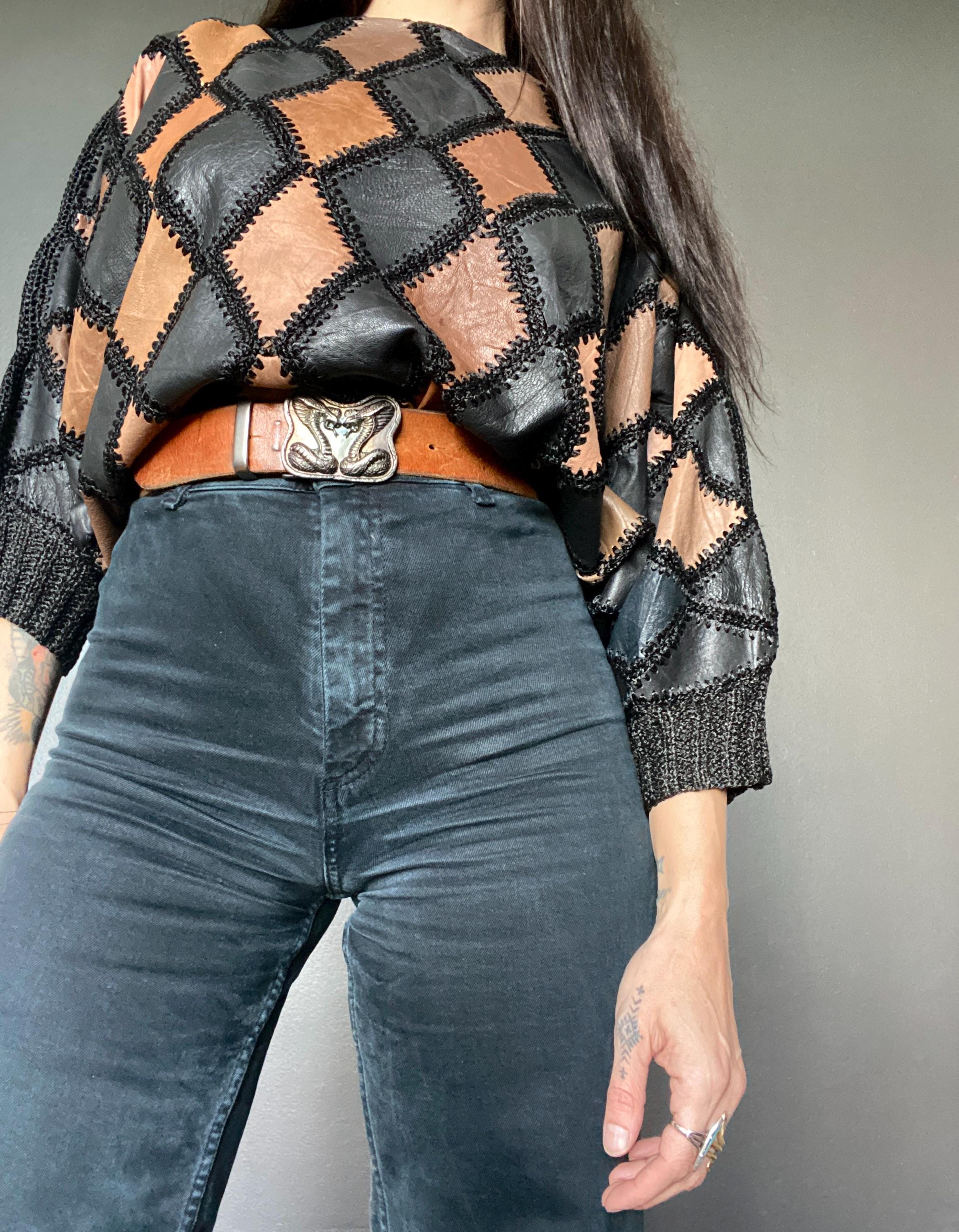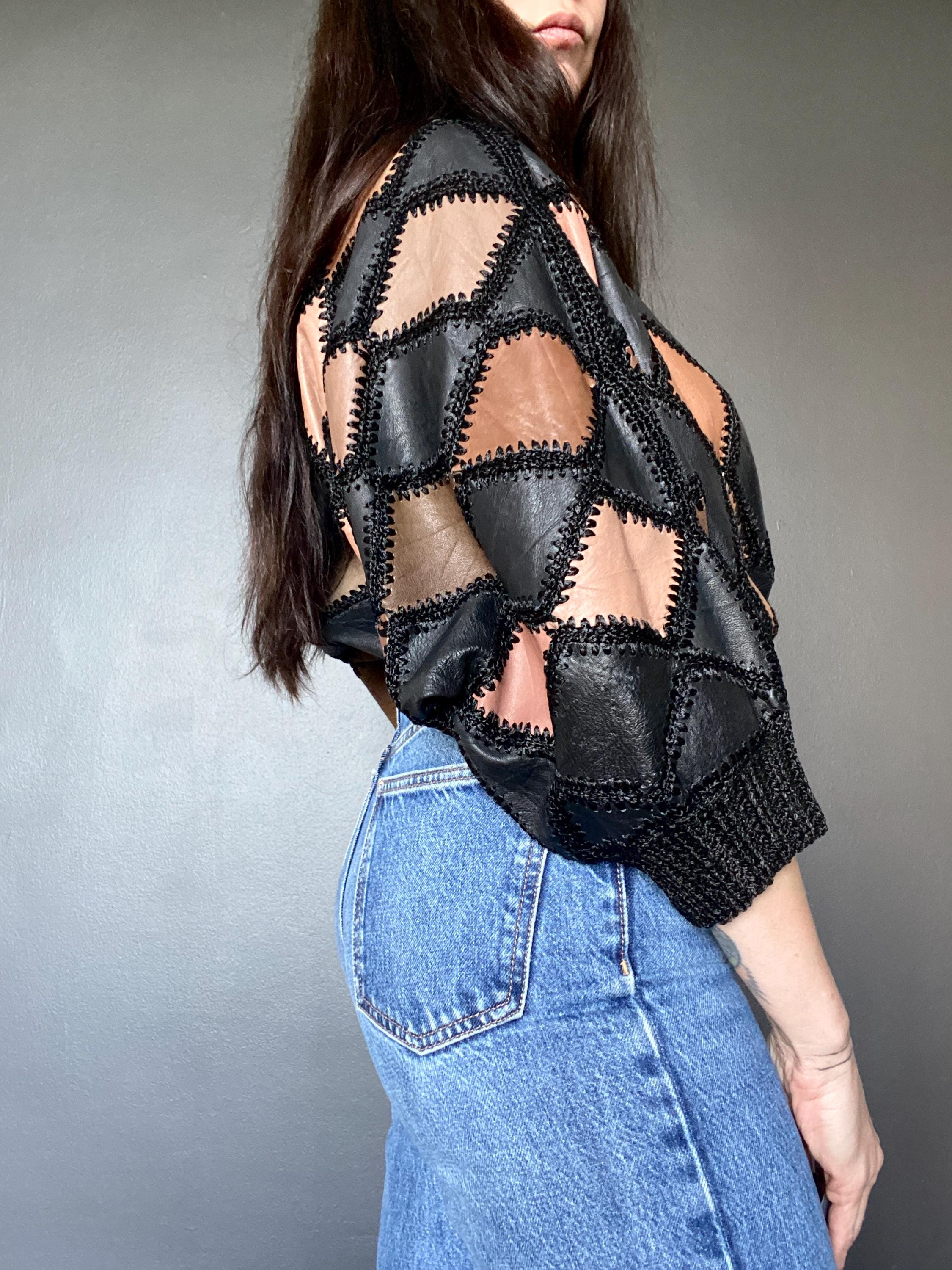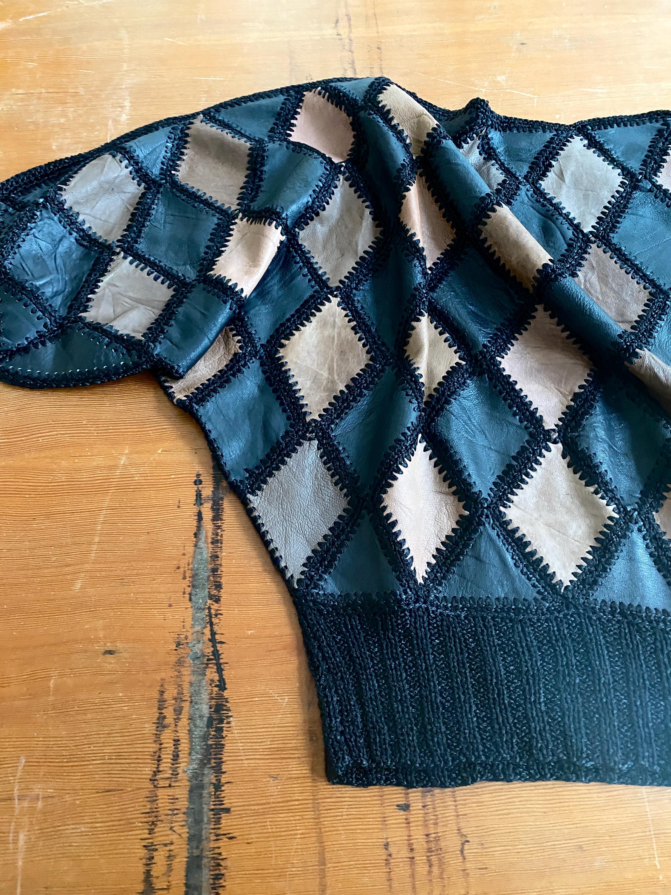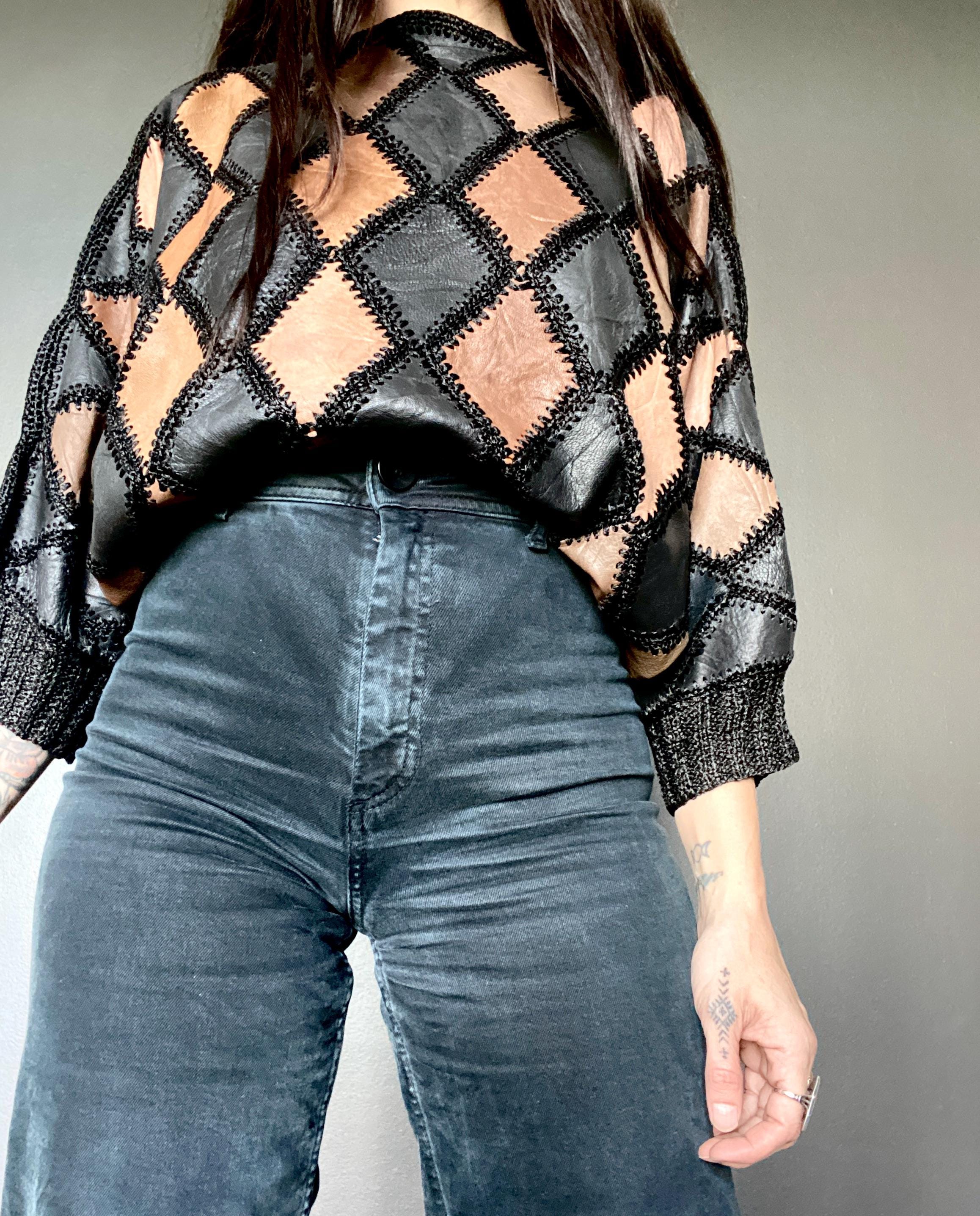 1970s crochet & leather patchwork blouse
