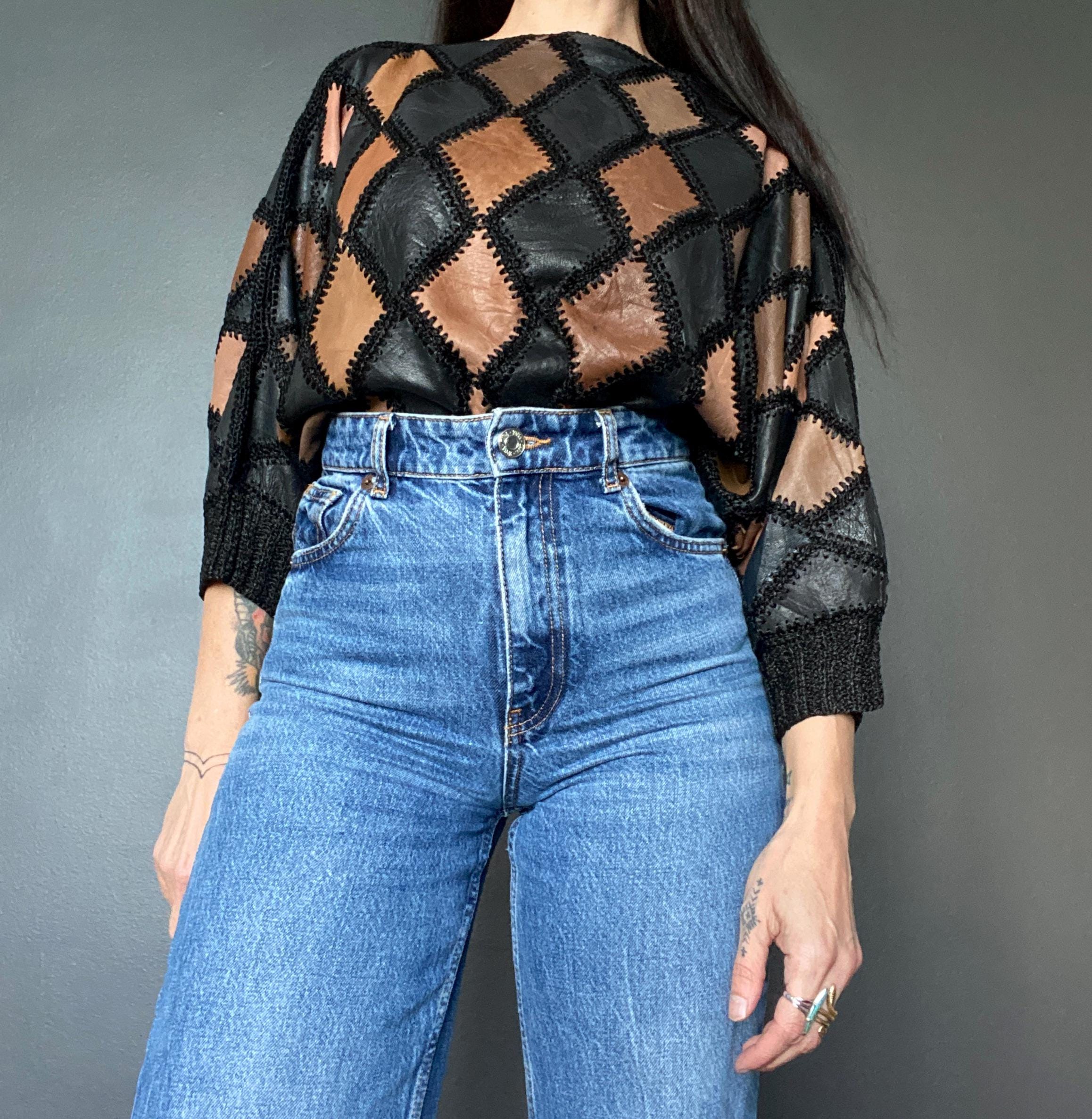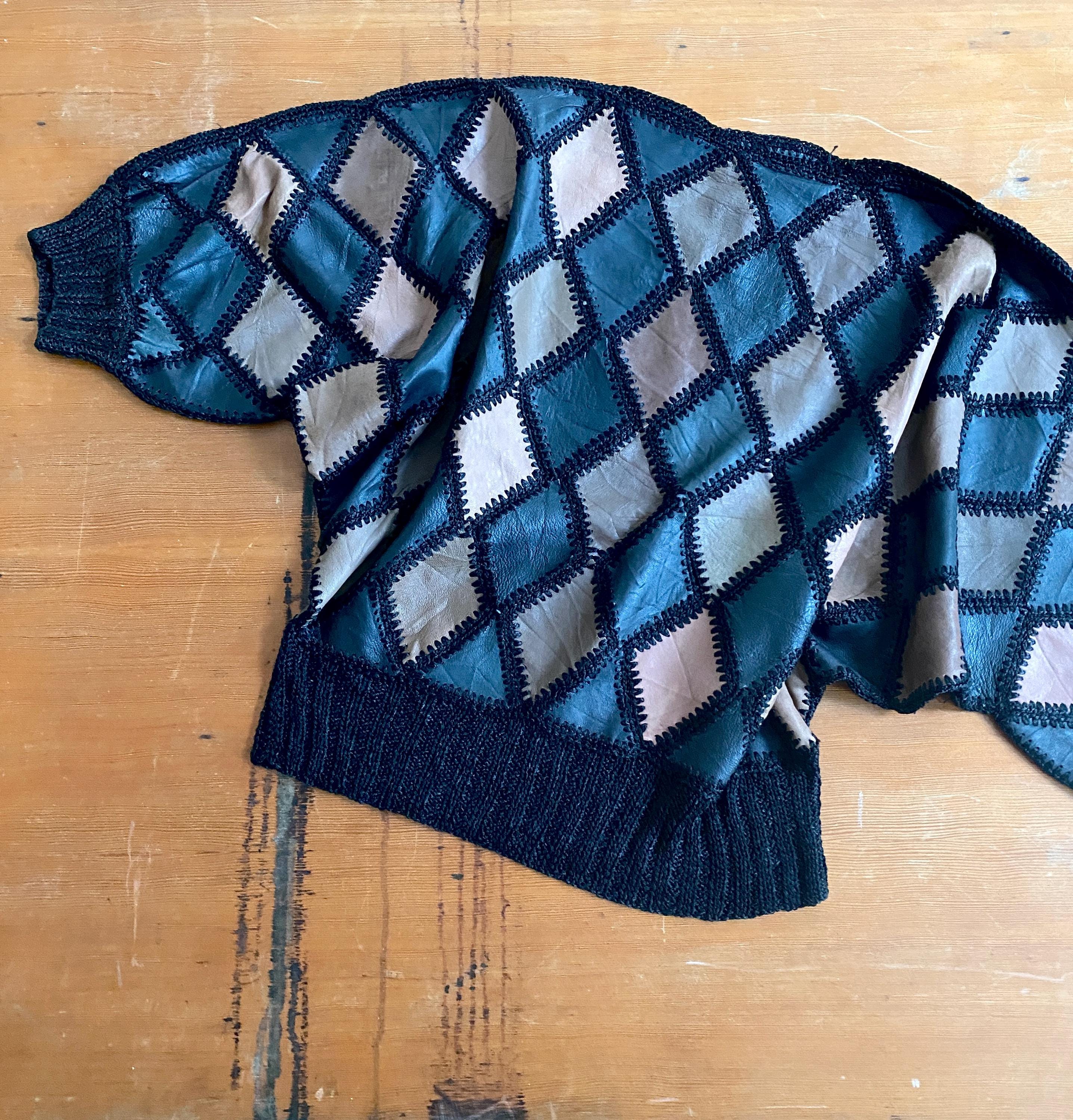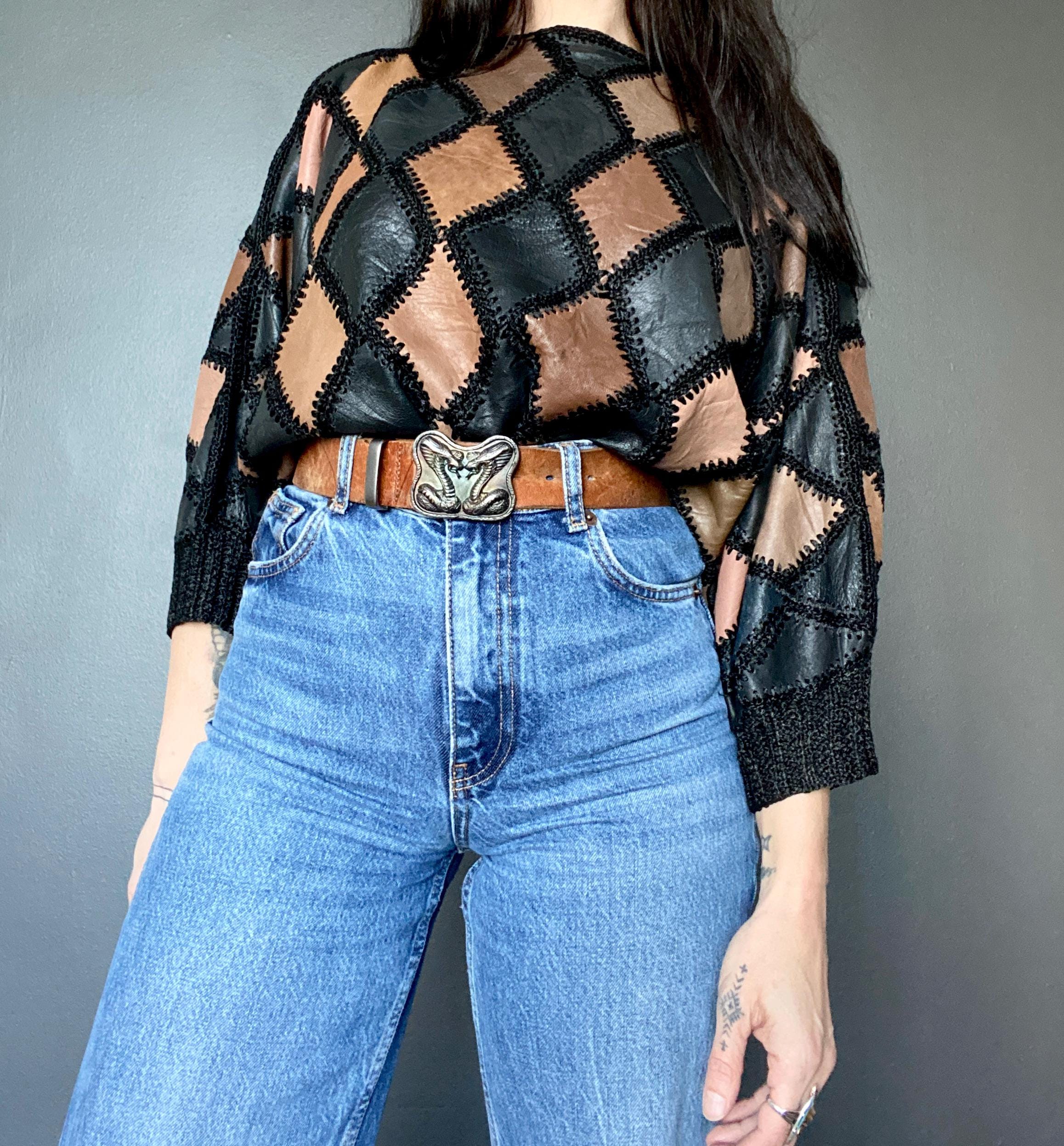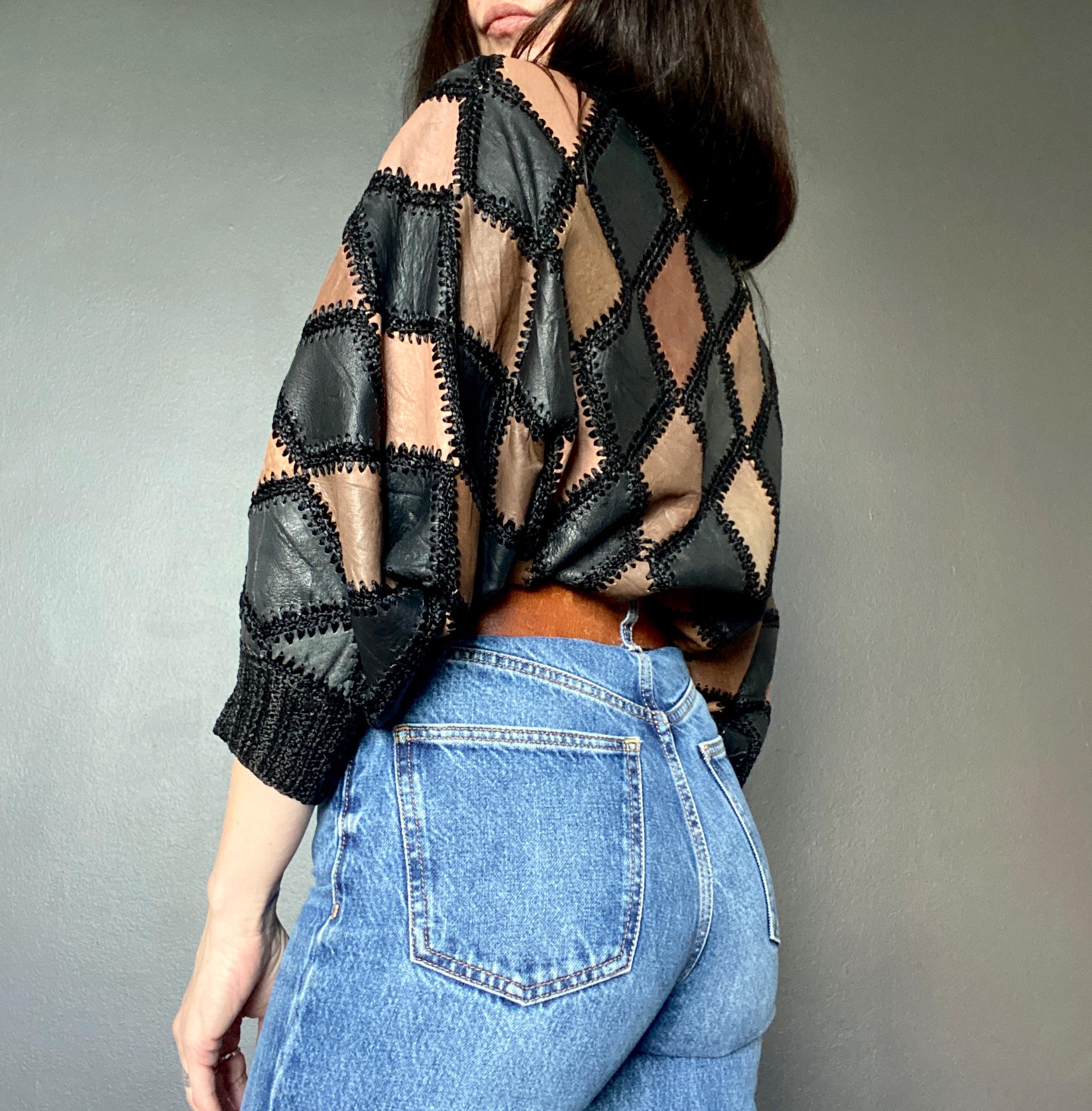 1970s crochet & leather patchwork blouse