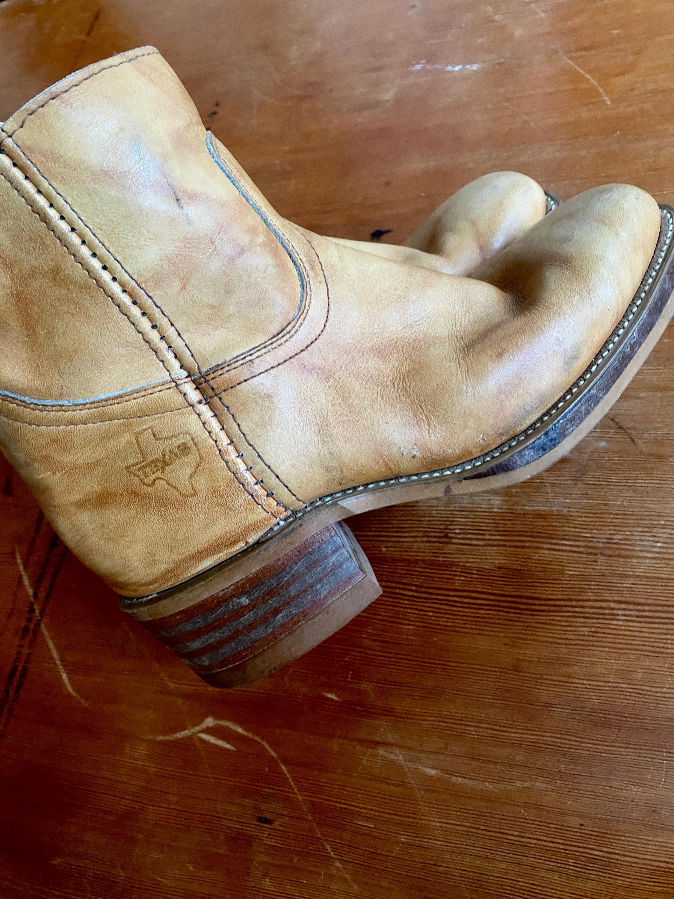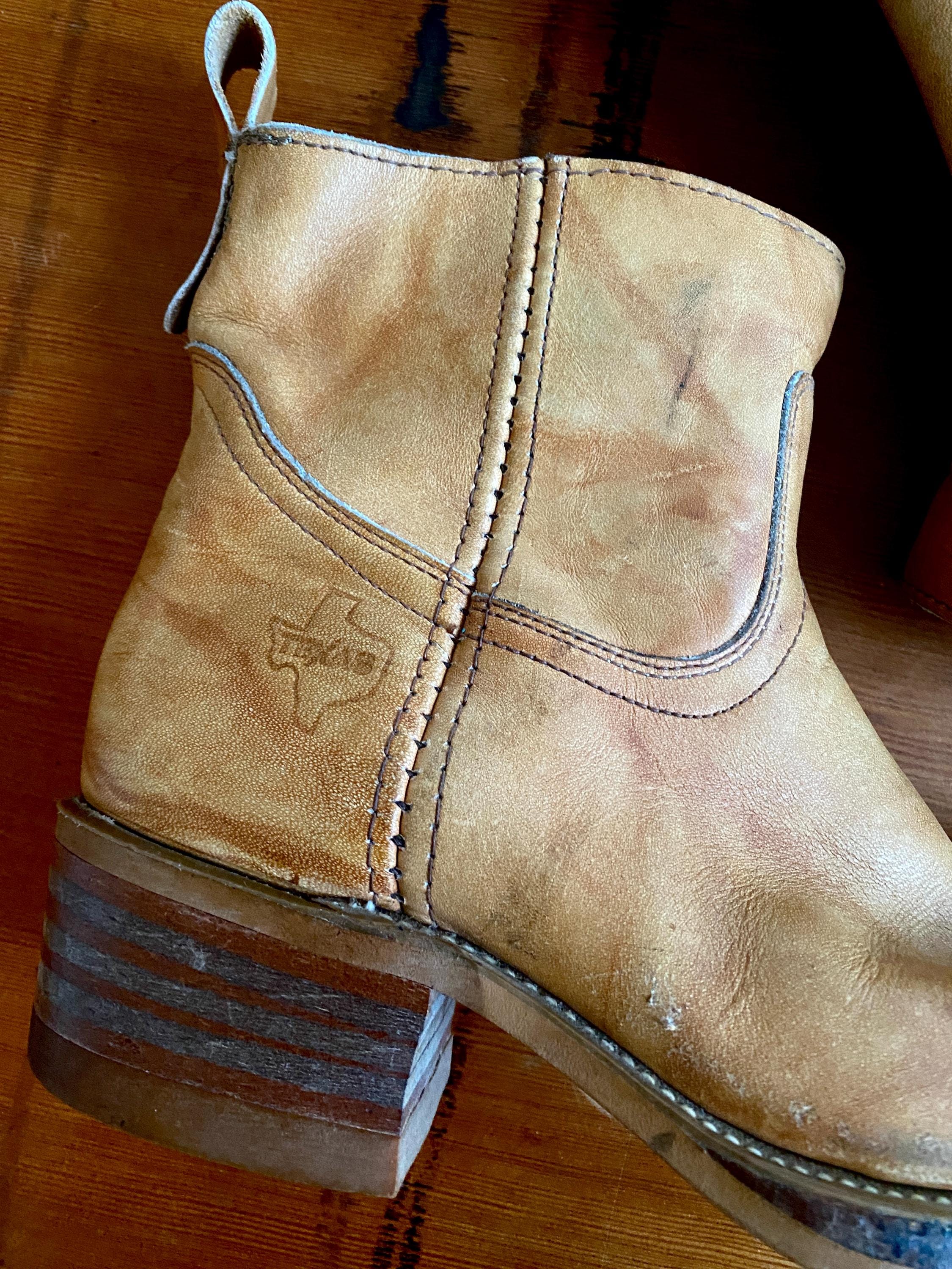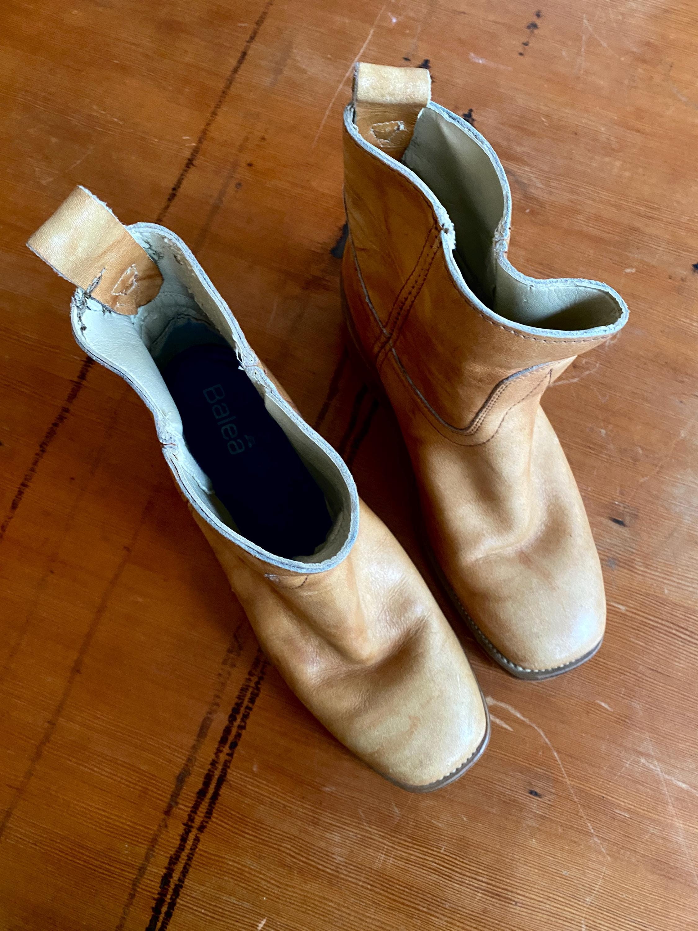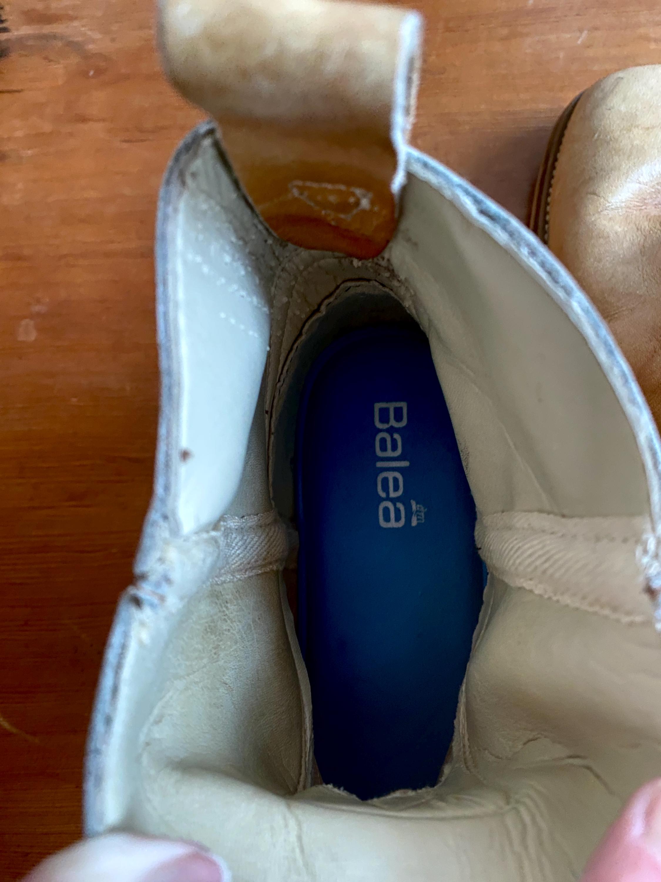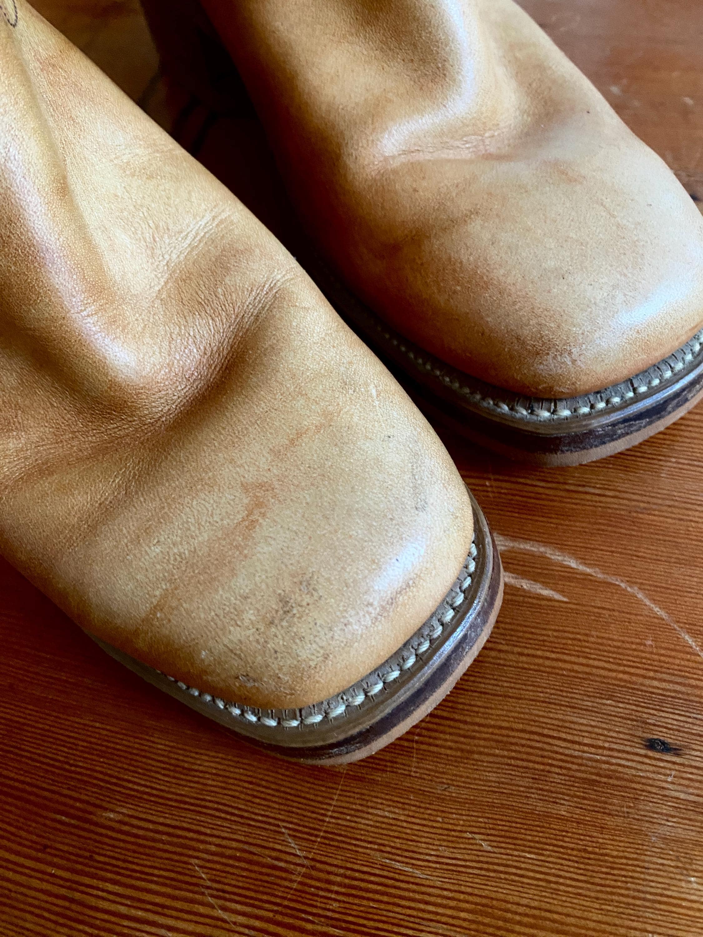 *Used vintage condition. The leather shows overall signs of age and wear with patina, some scuffs, marks and stains but still in good wearable condition. The soles show minimal signs of age and wear. There has been a tear on the back on one of the boots but has been sewn by a cobbler (see picture). Also a pair comfort gel insoles have been super glued into the boots, which makes them feel very comfortable. The estimated size is also based on this.