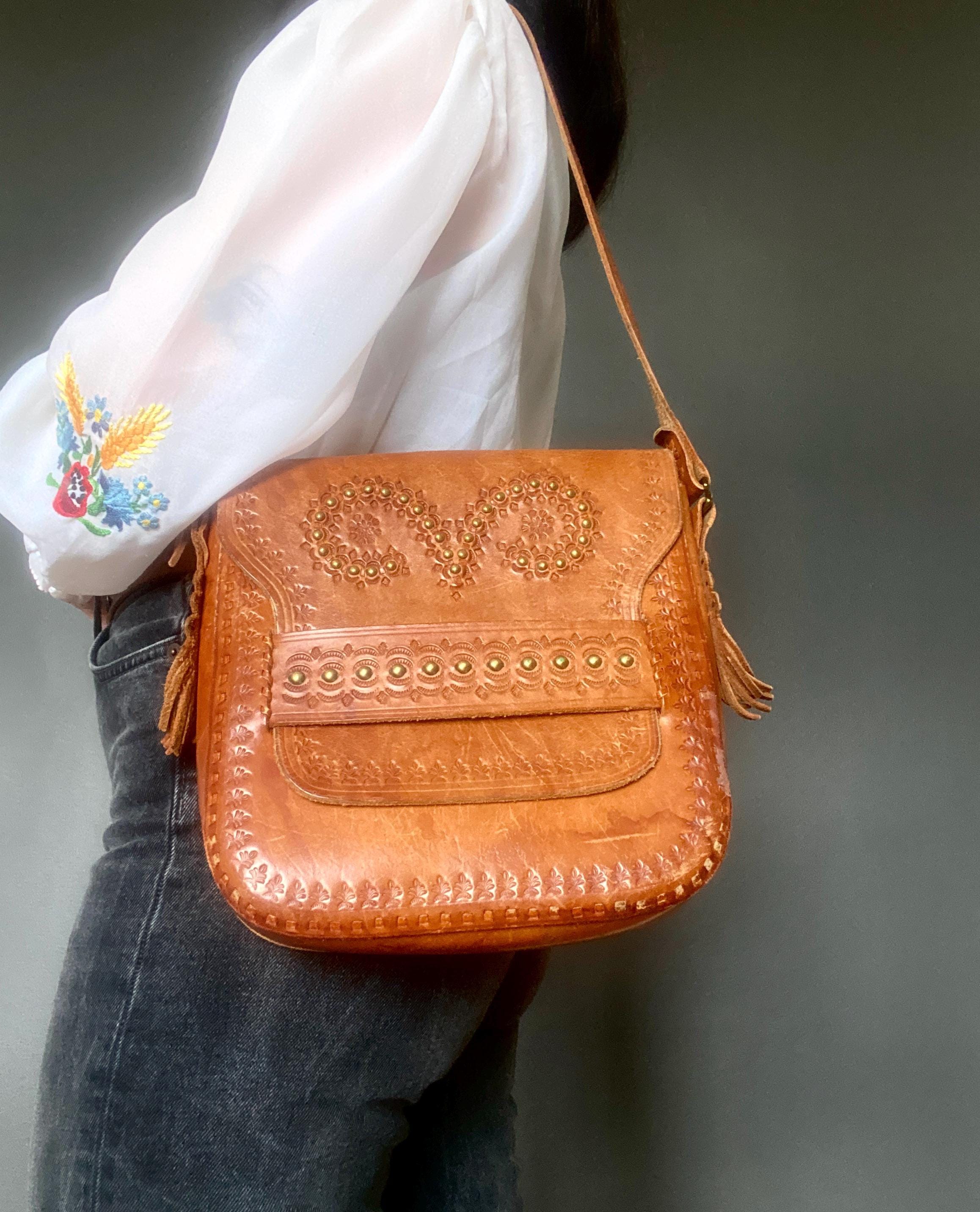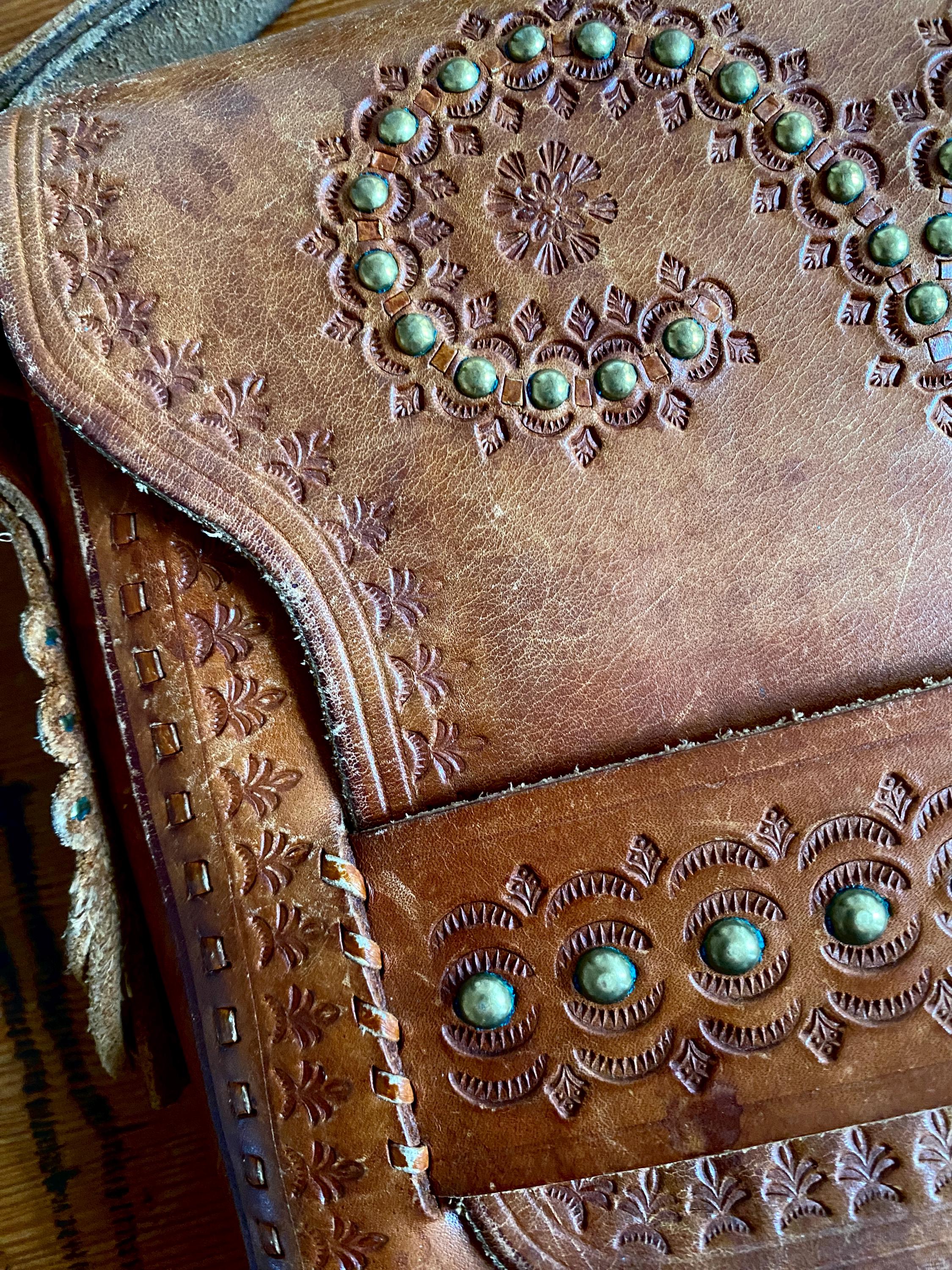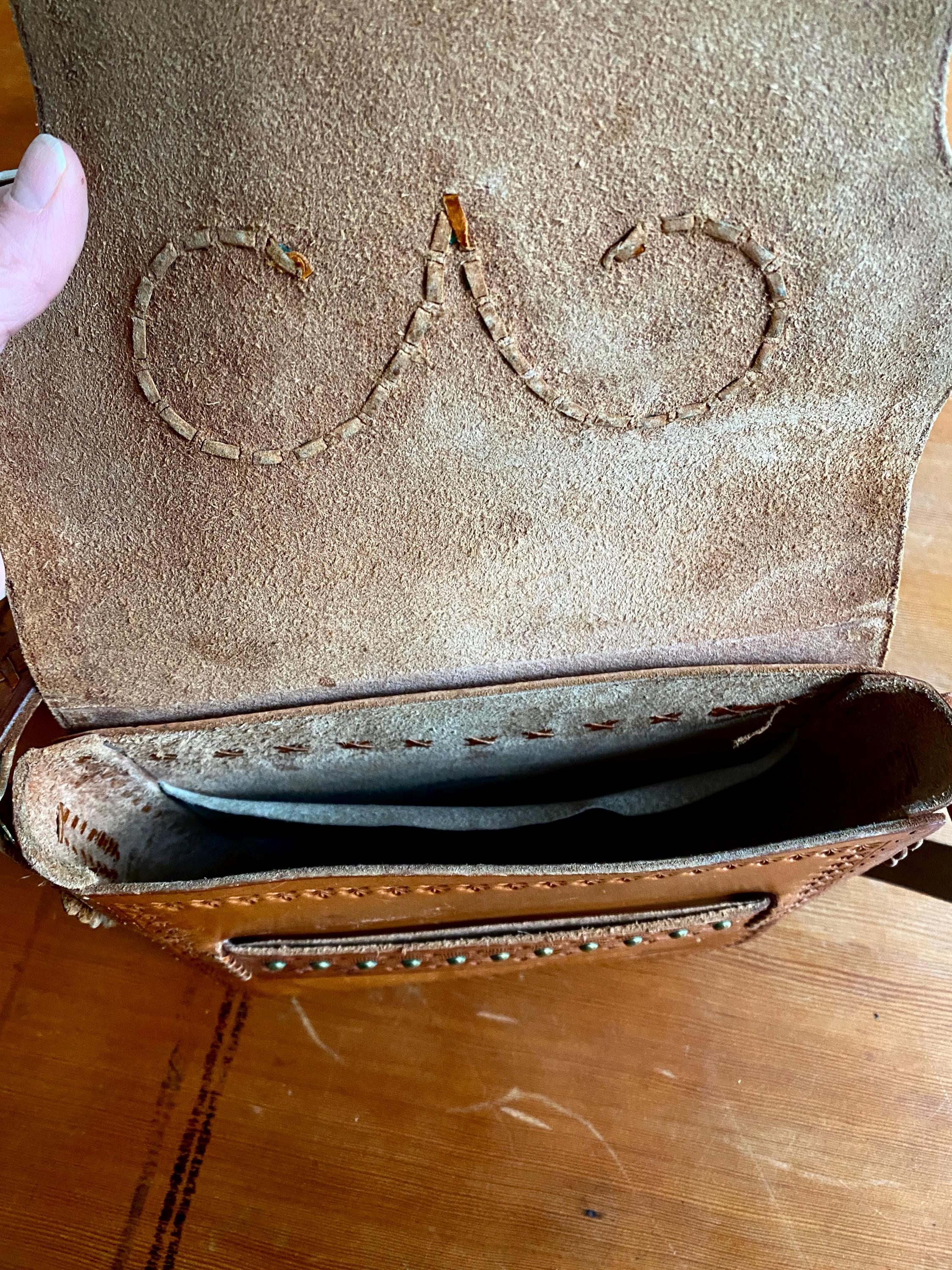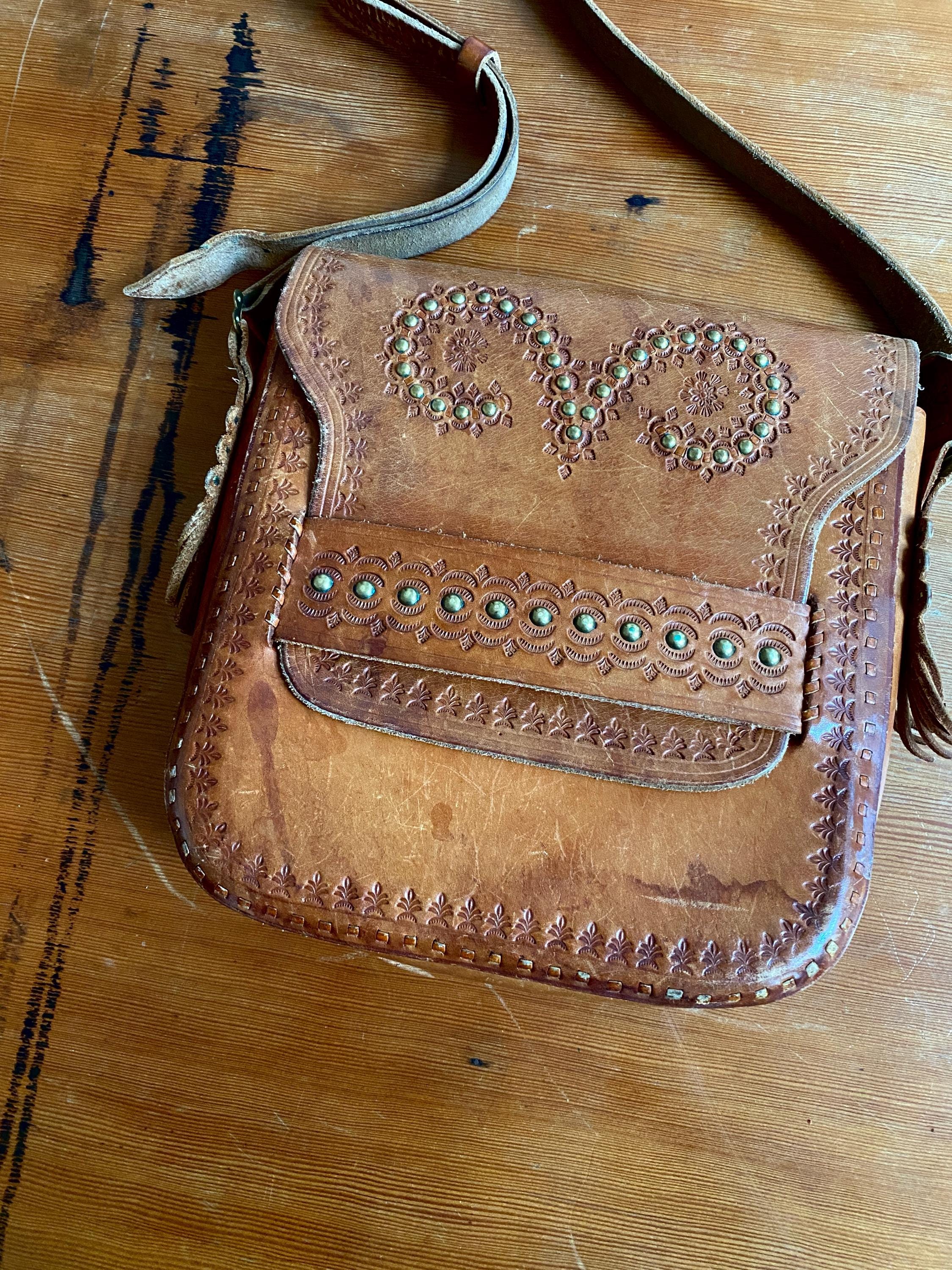 Large 1970s tooled handmade leather shoulder bag.
