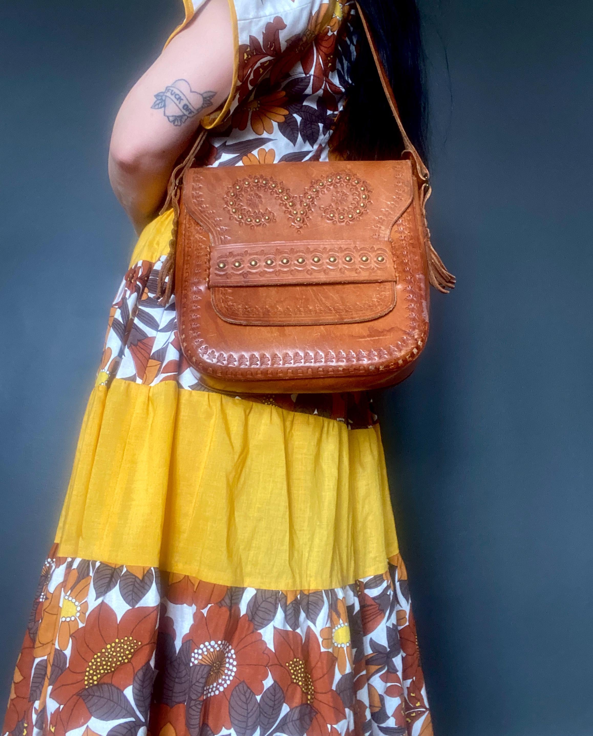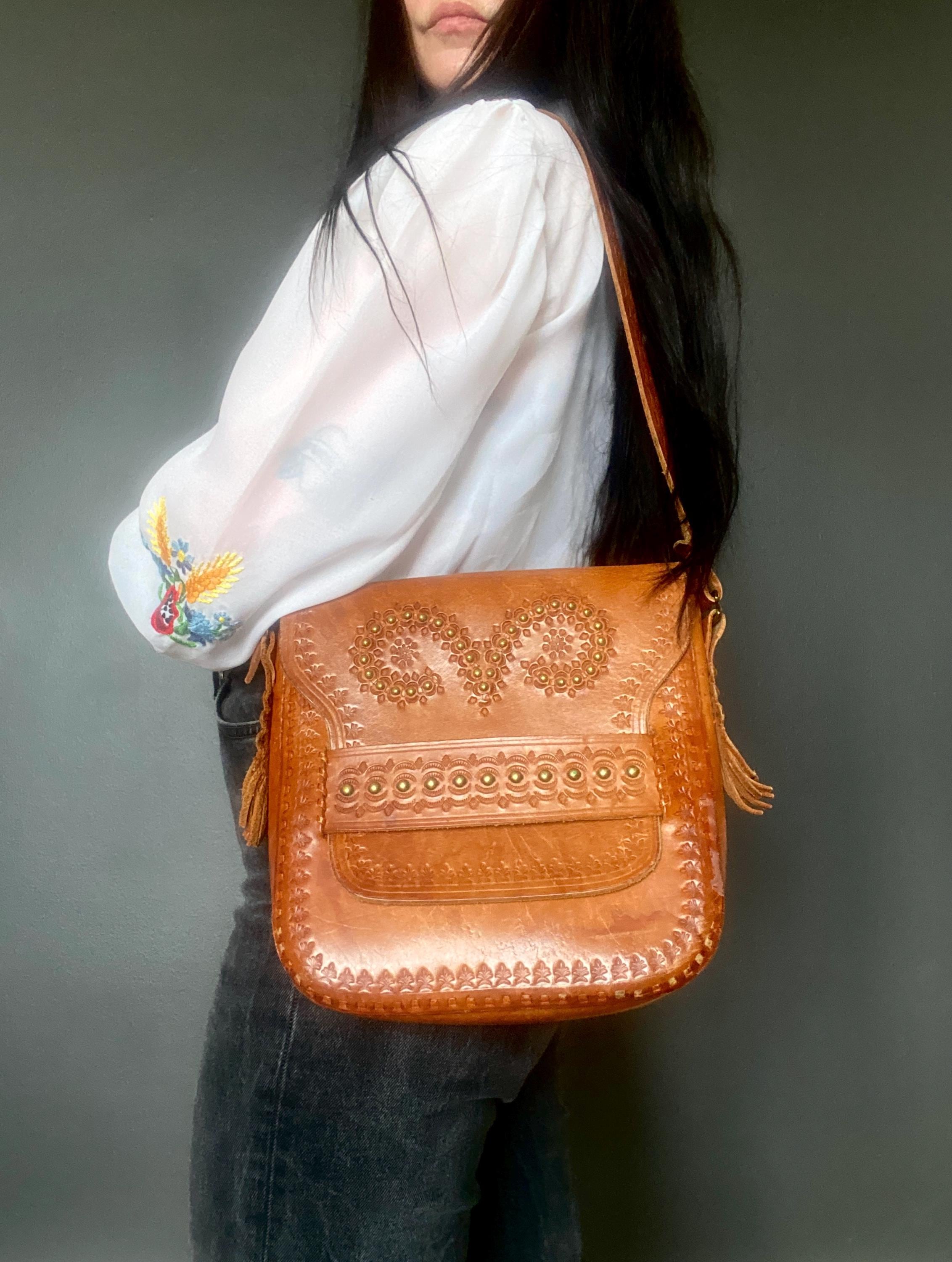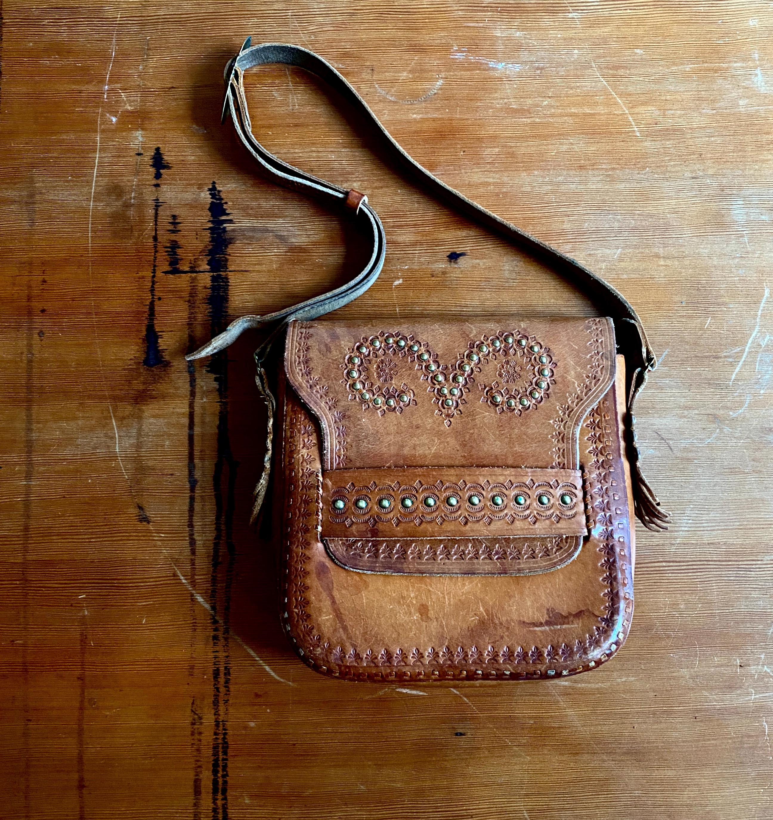 Large 1970s tooled handmade leather shoulder bag.