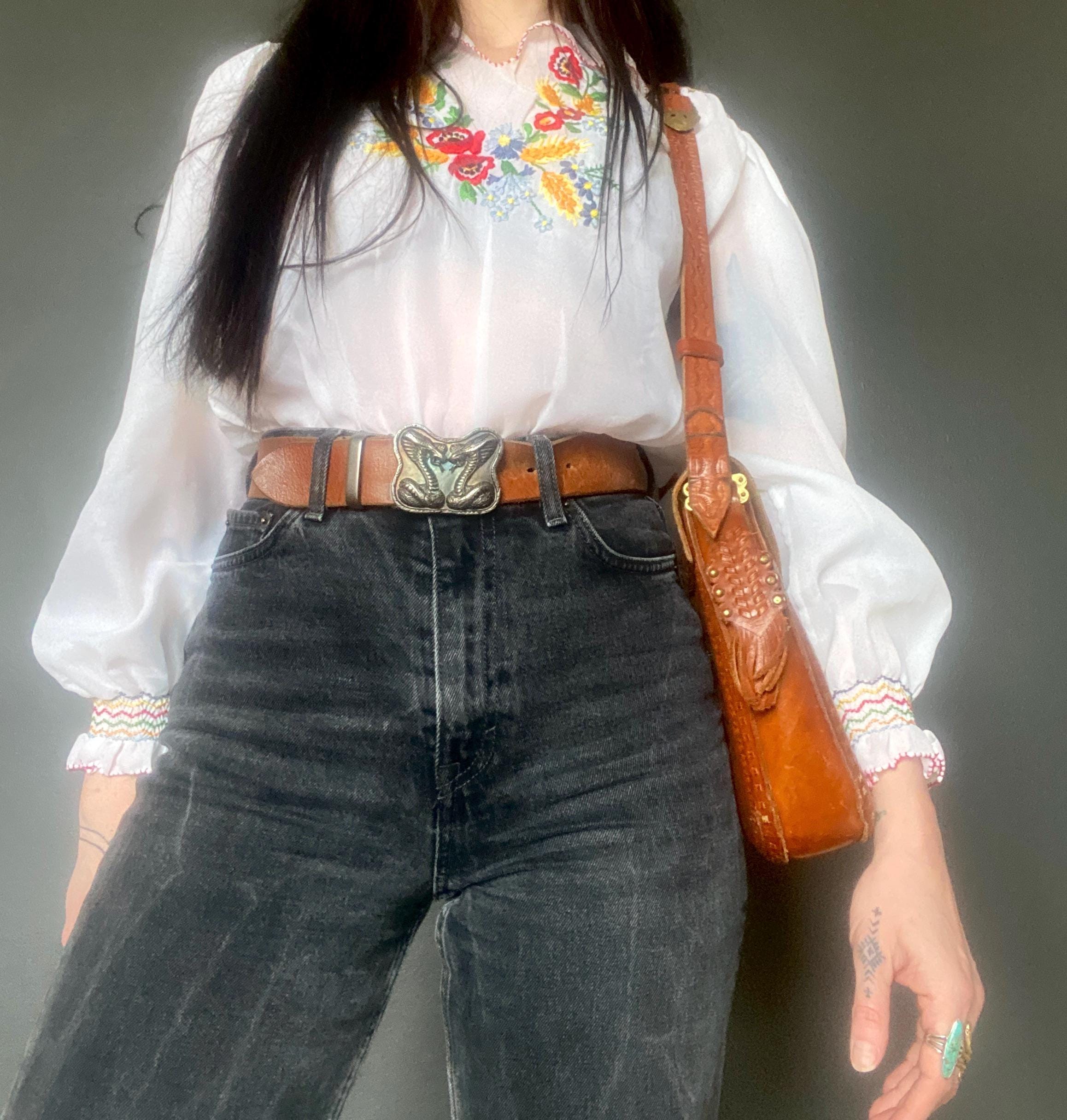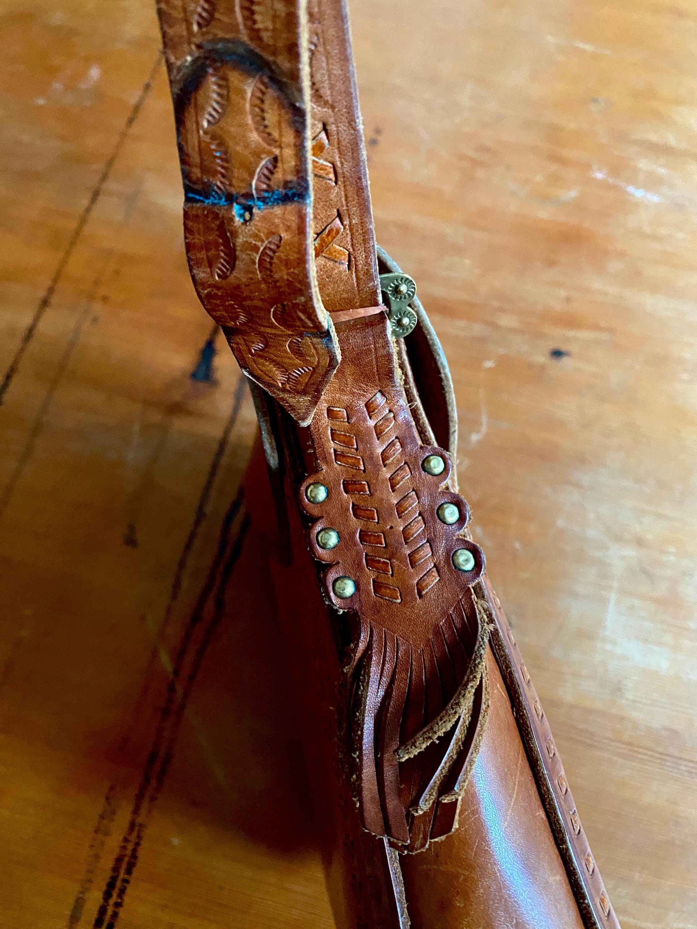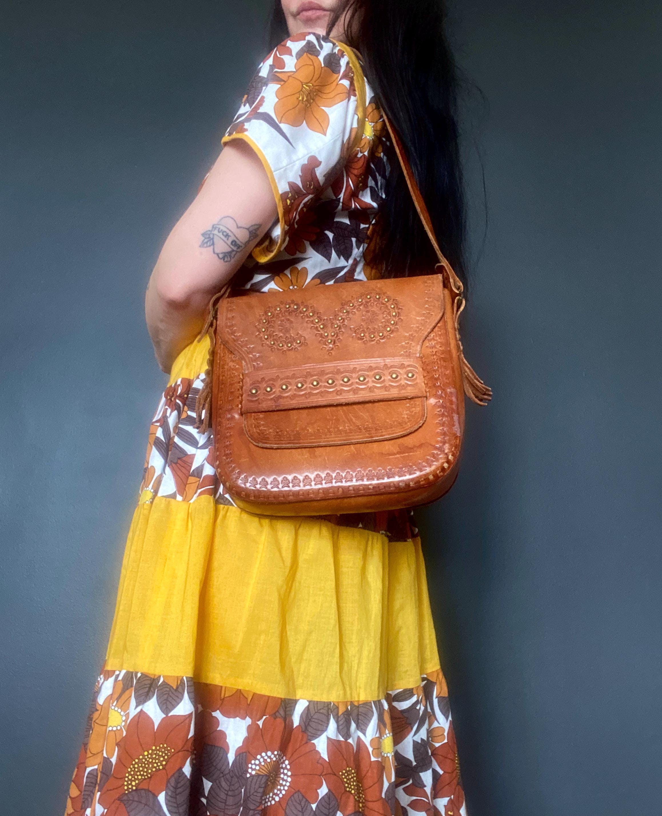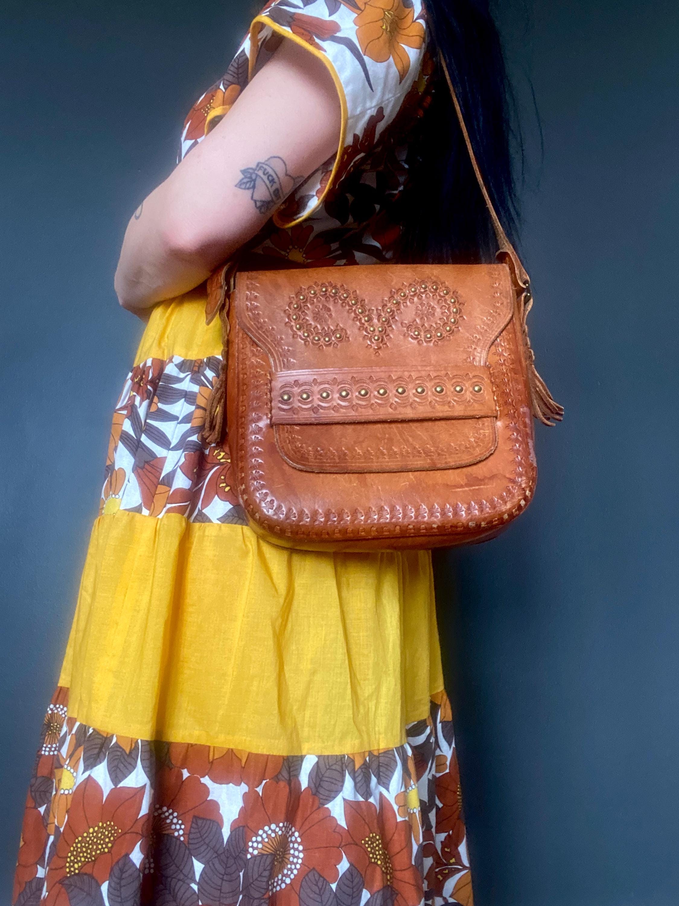 Large 1970s tooled handmade leather shoulder bag.