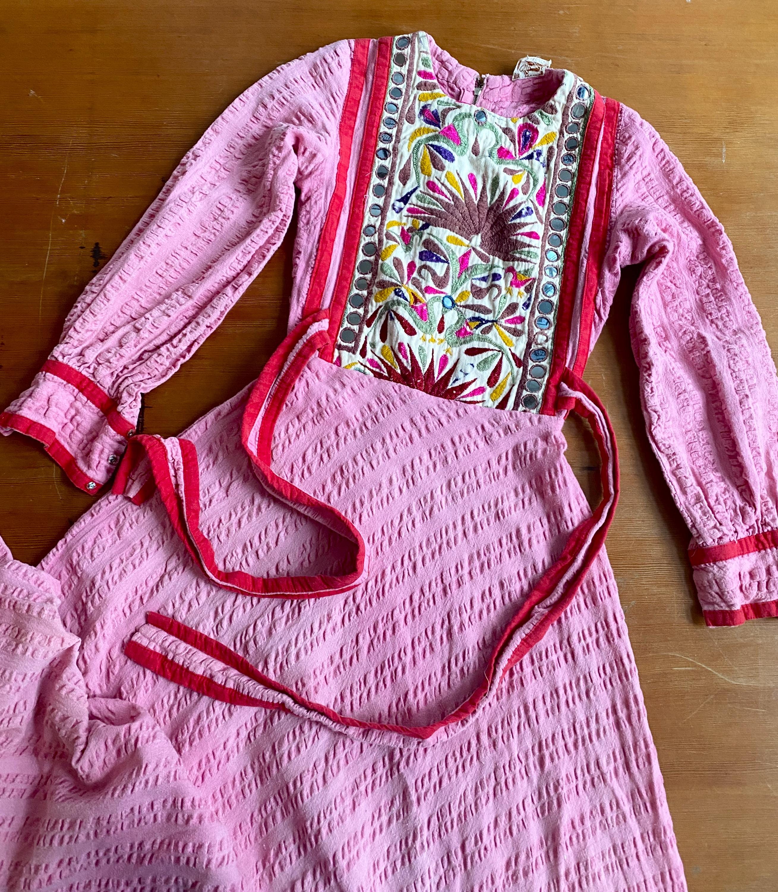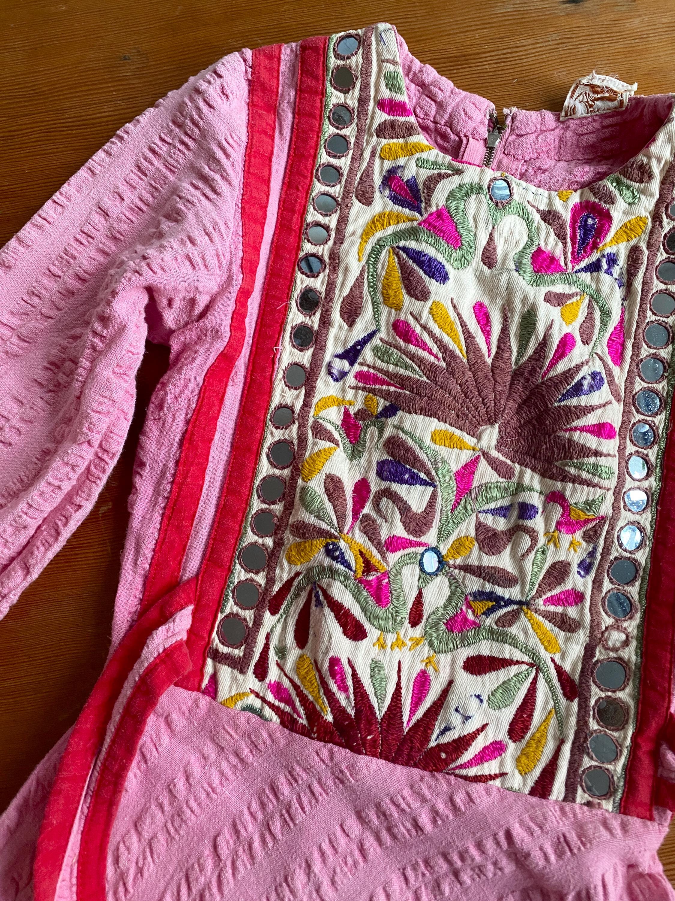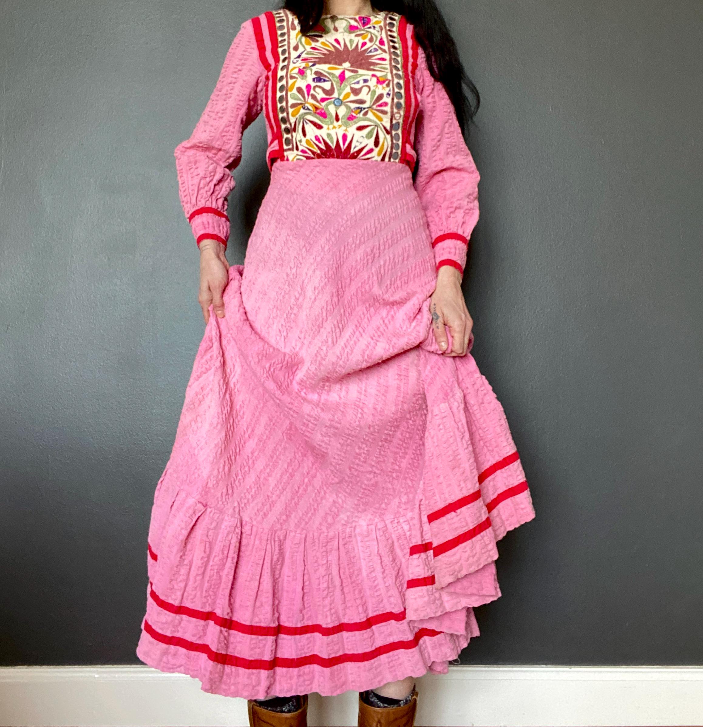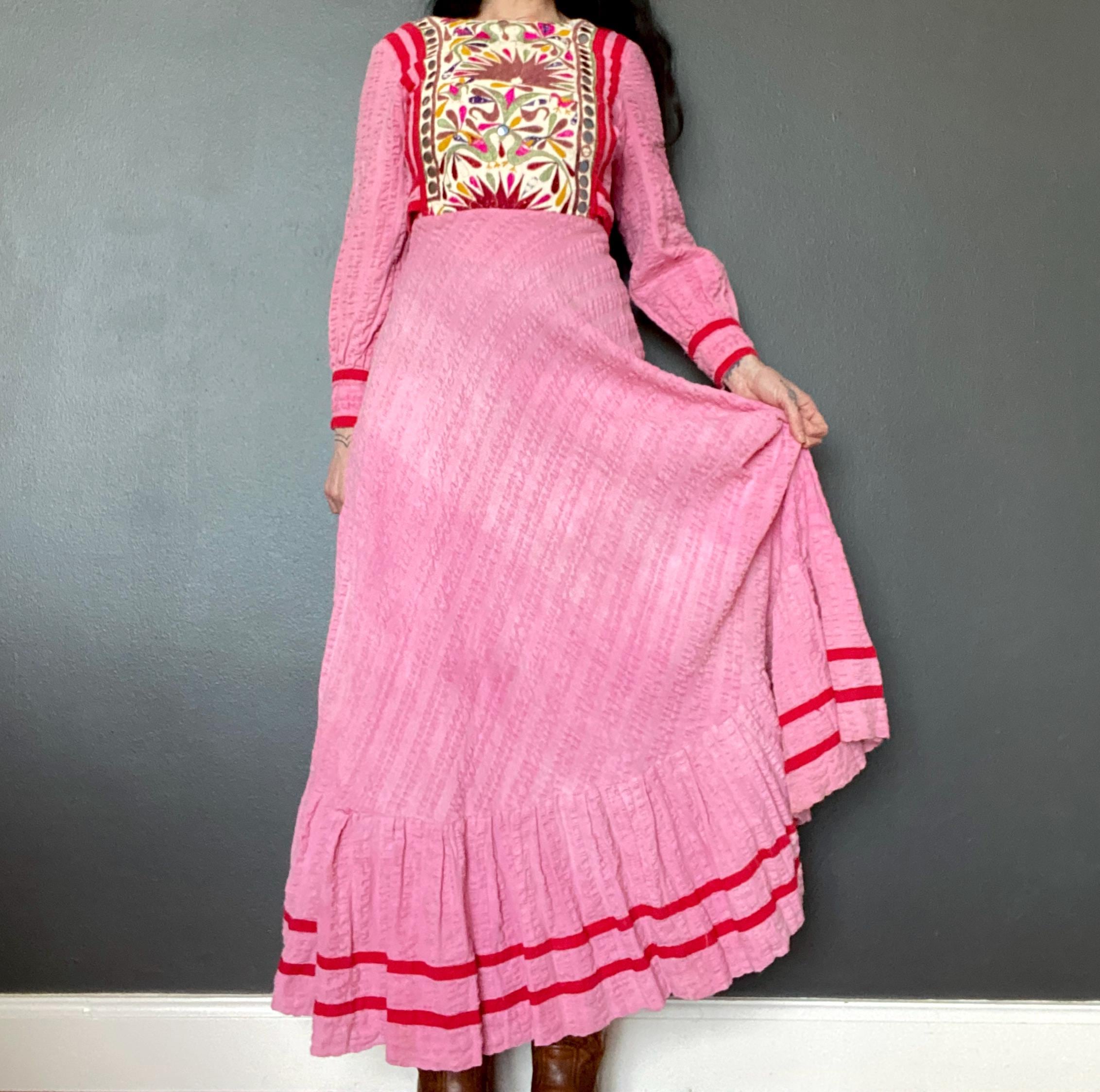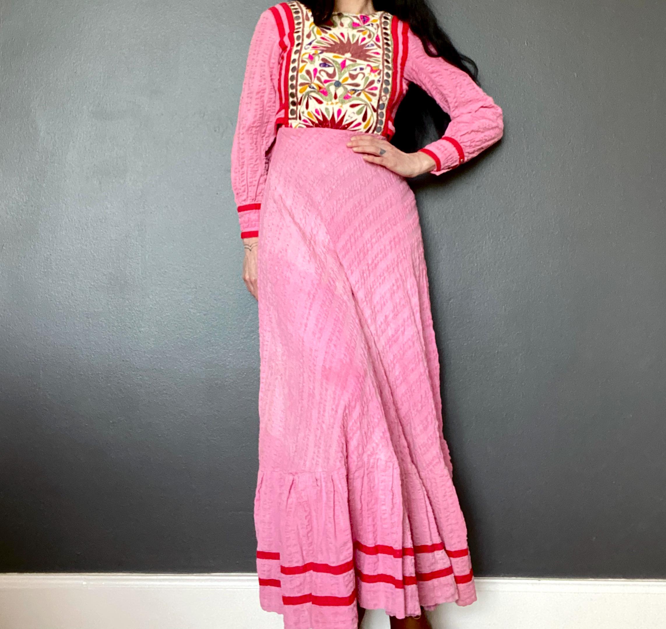 *Used vintage condition. Shows signs of age and wear. The skirt has some faded areas and the the embroidery shows clear signs of age and wear (see pictures) The hem has some discoloration and there is a small hole on the skirt.