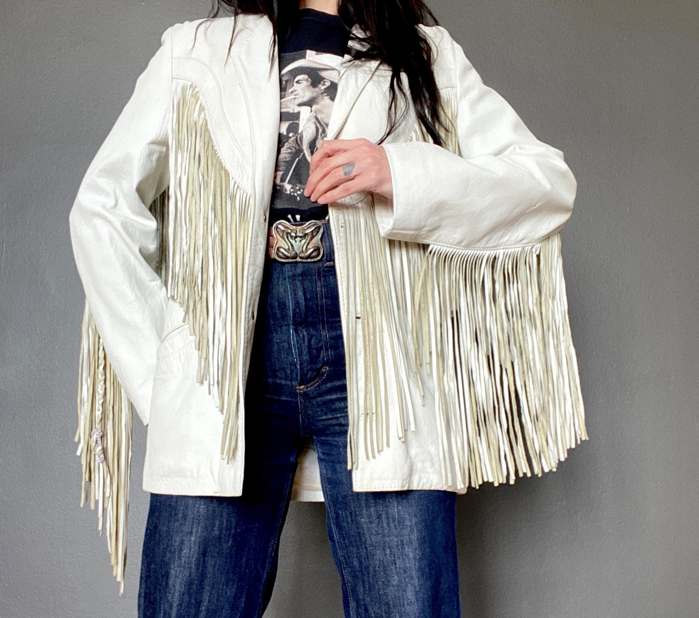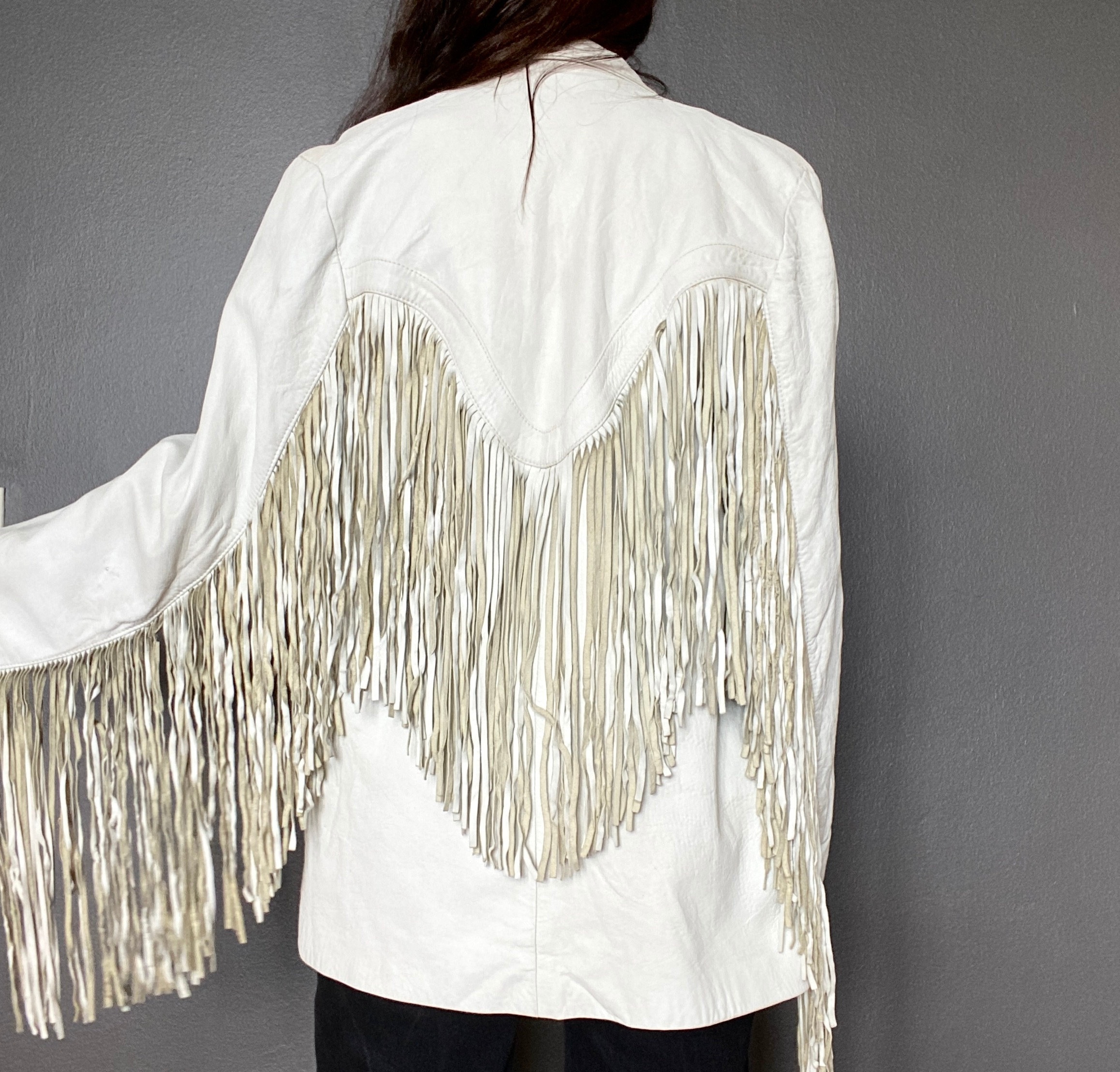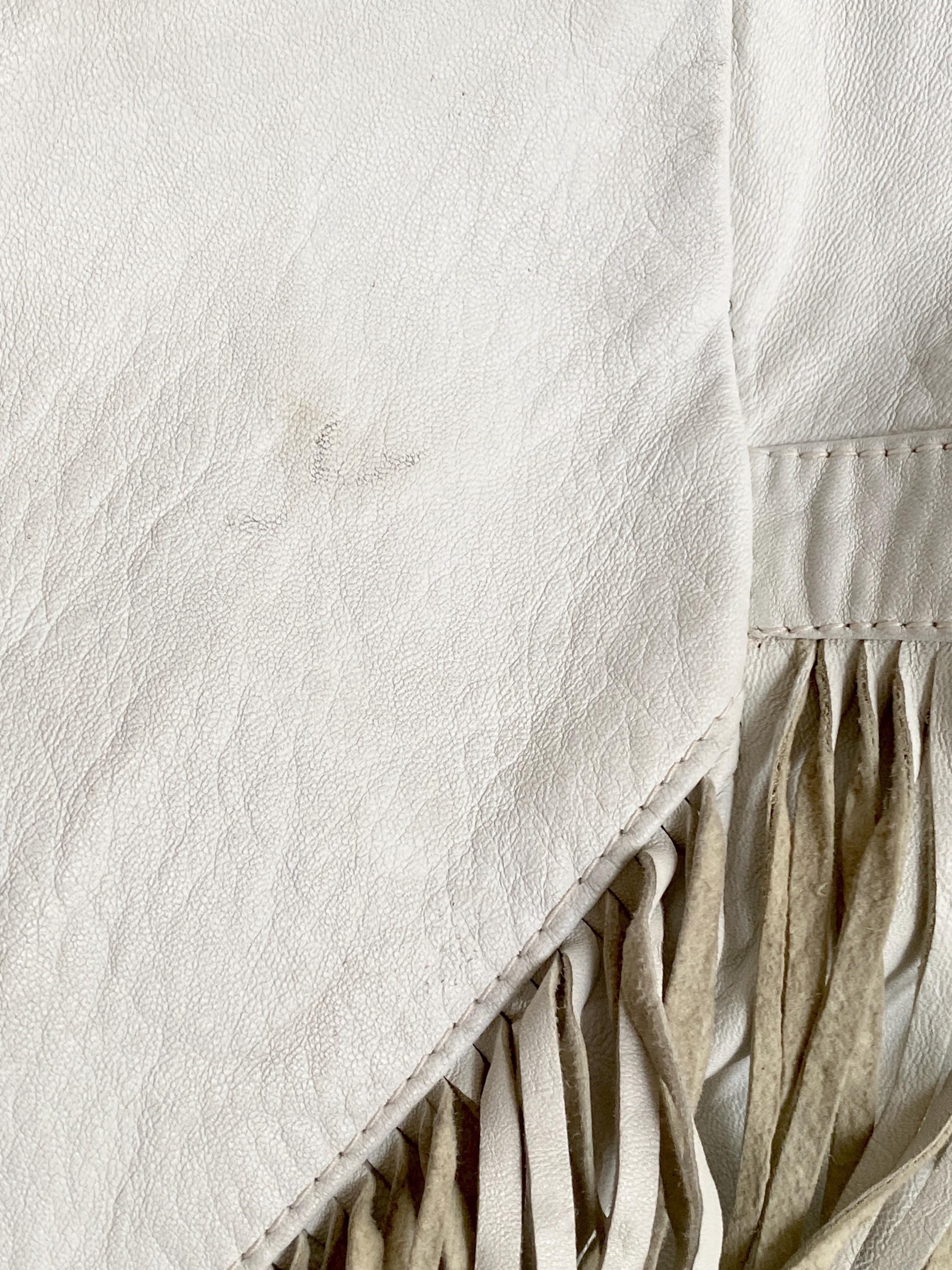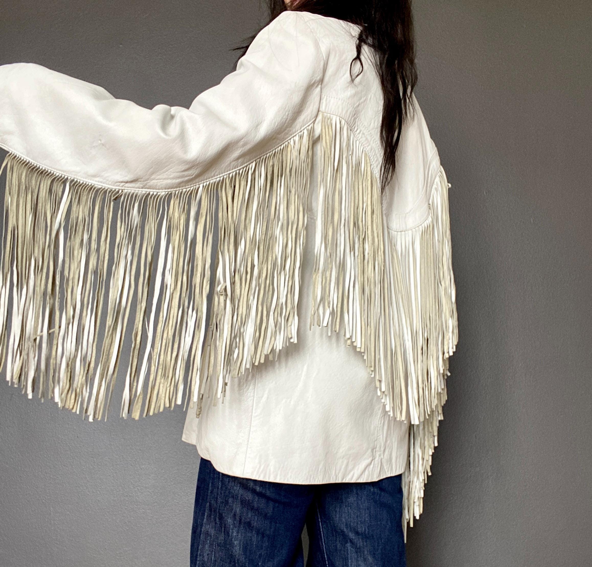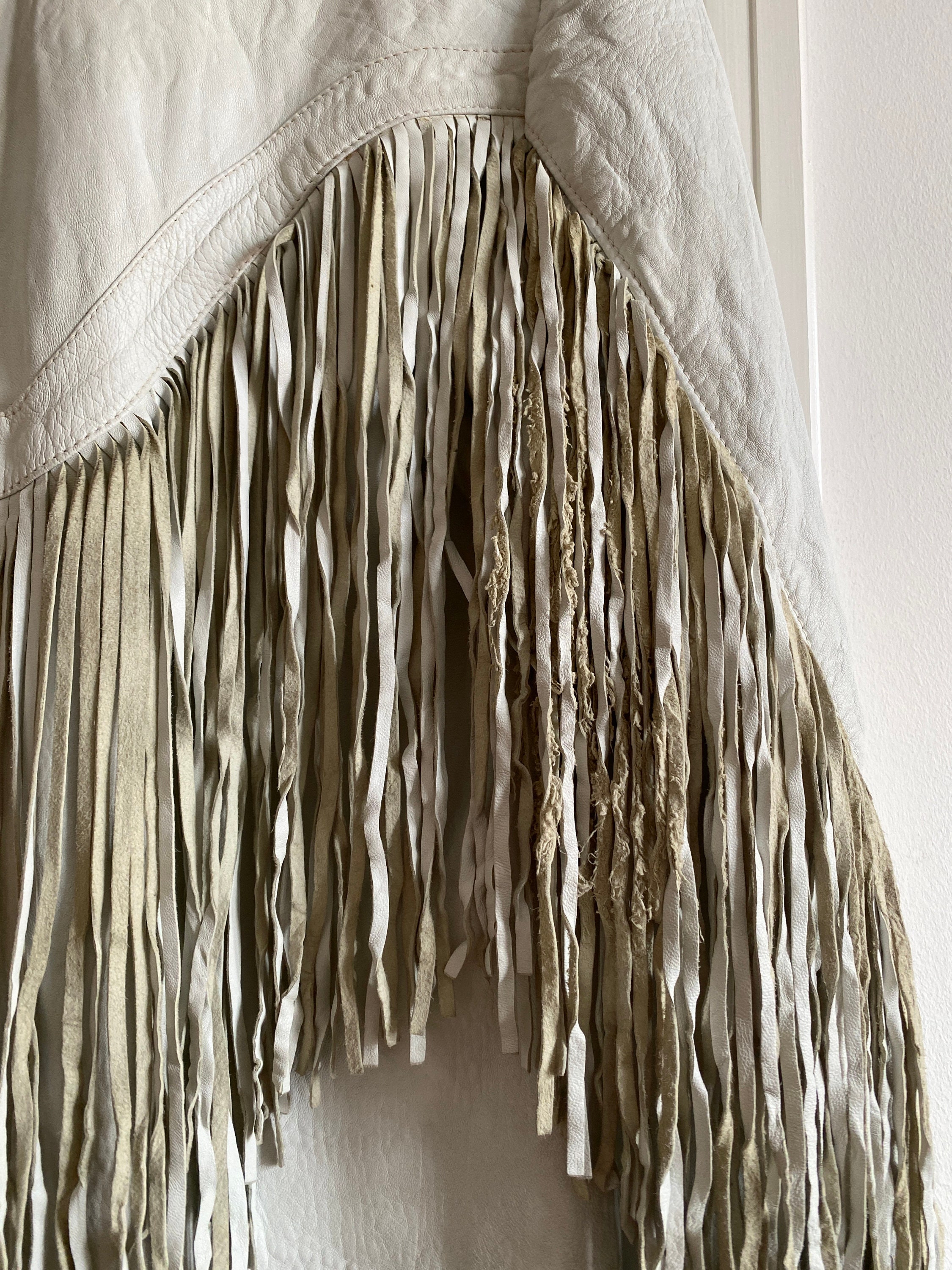 *Amazing white leather jacket with fringe on the front, back and sleeves.