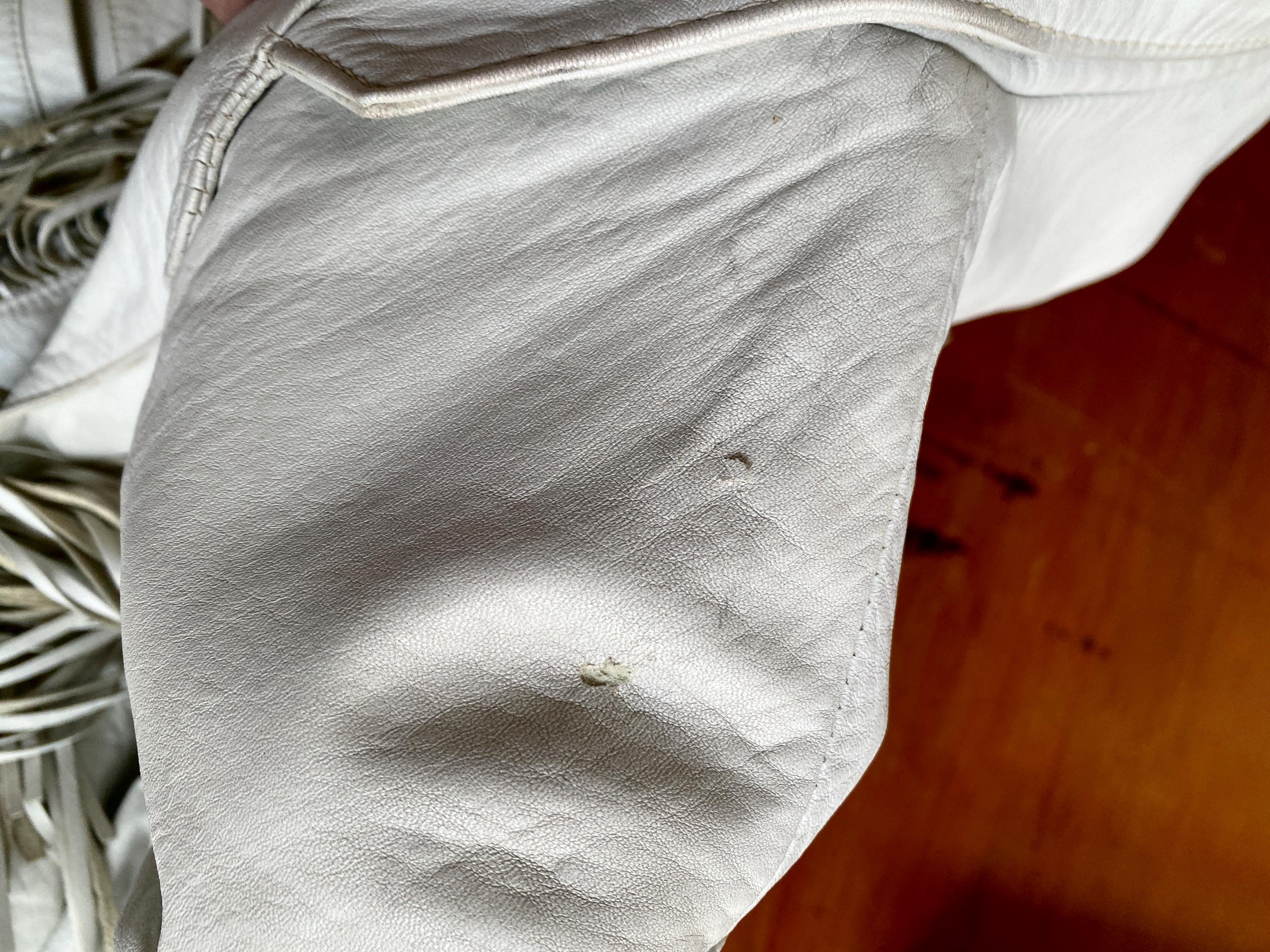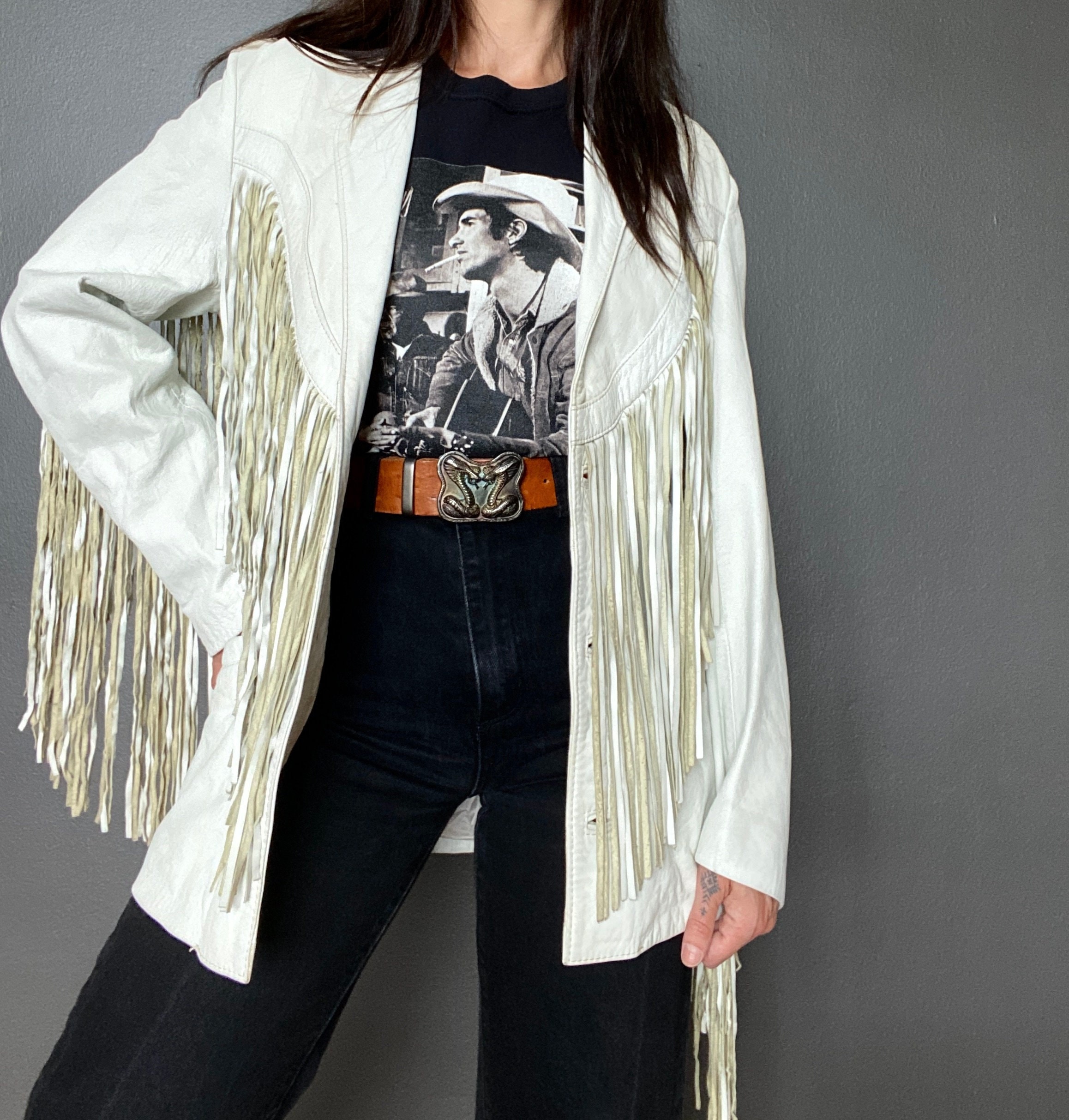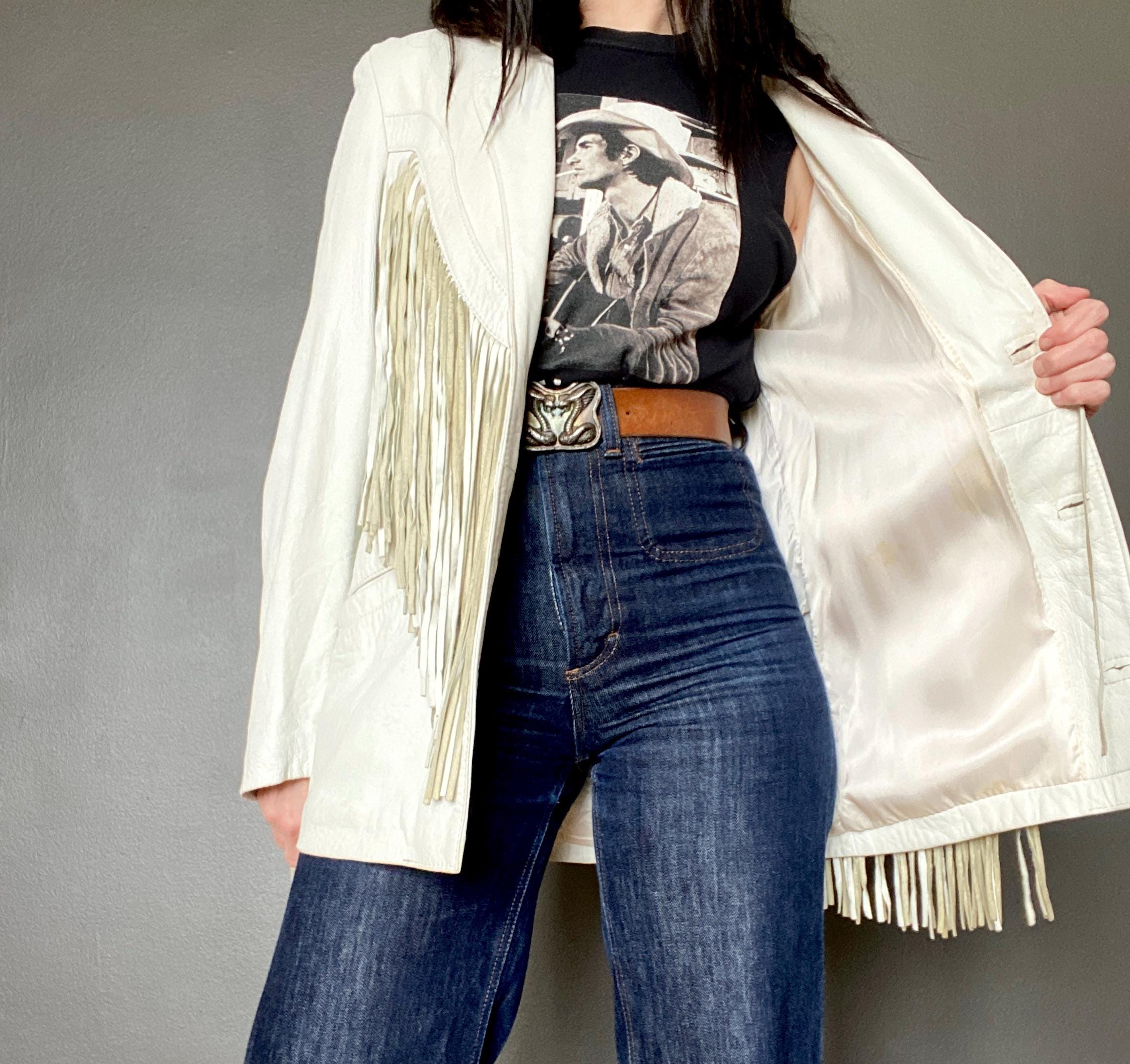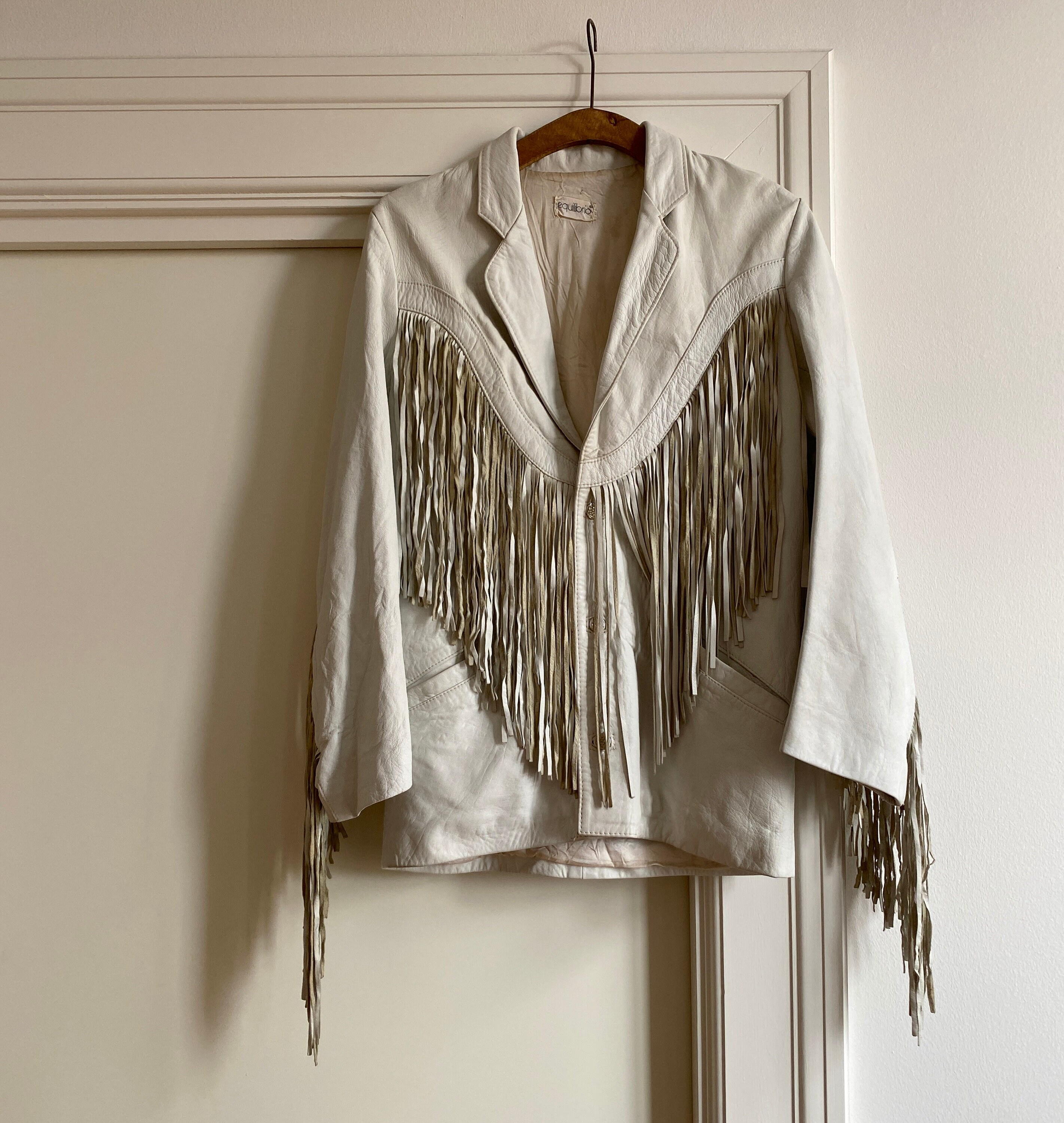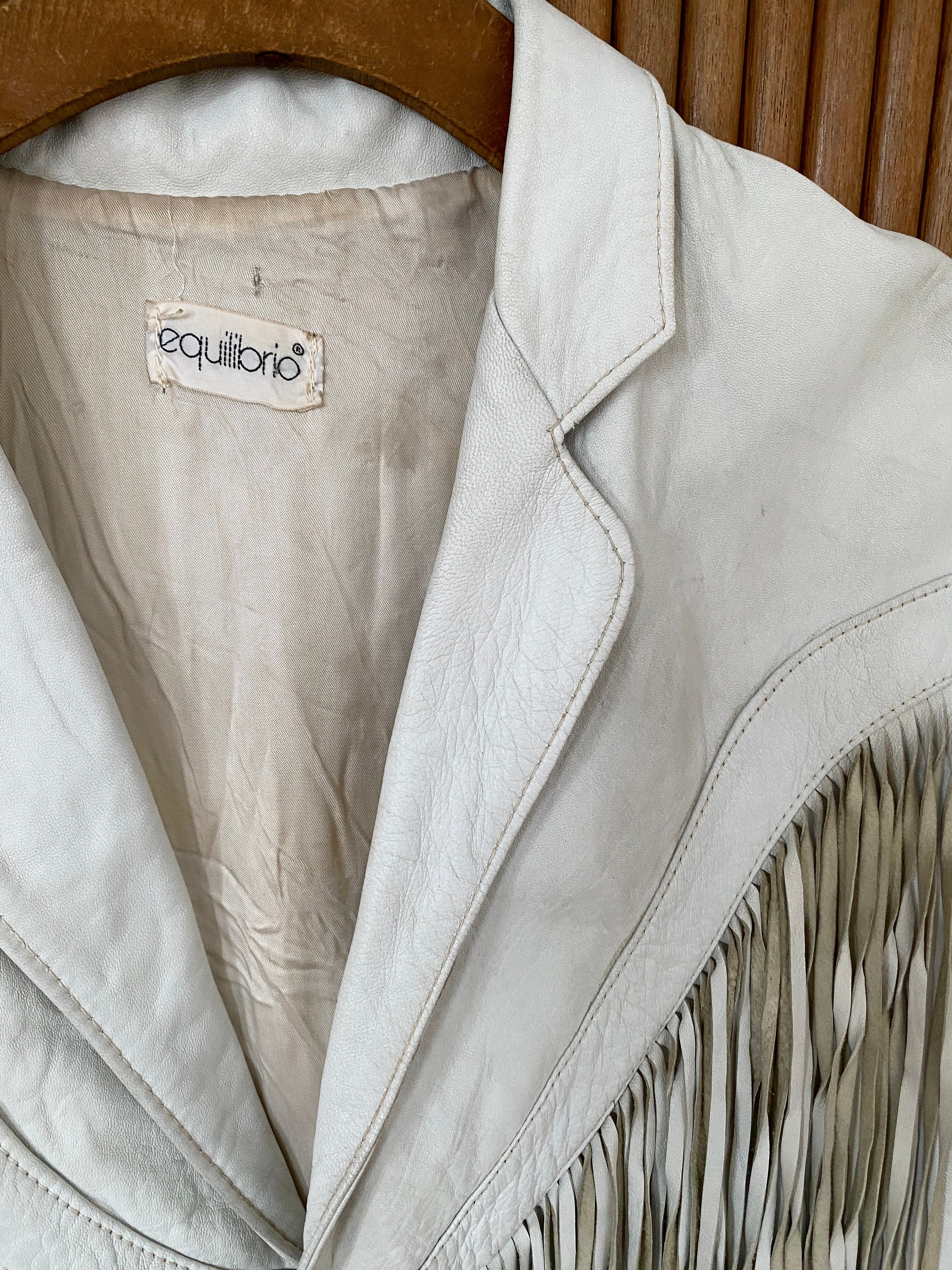 *Amazing white leather jacket with fringe on the front, back and sleeves.